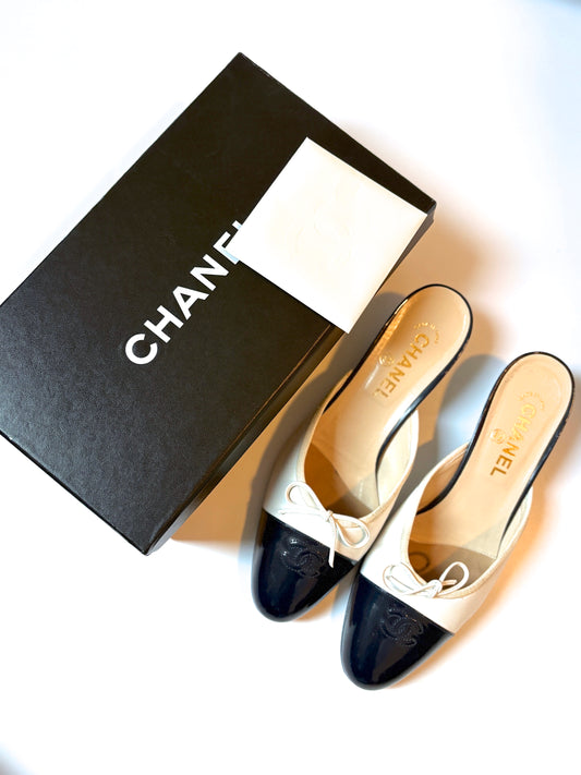 Chanel Beige and Black Bow Kitten Mules UK 7