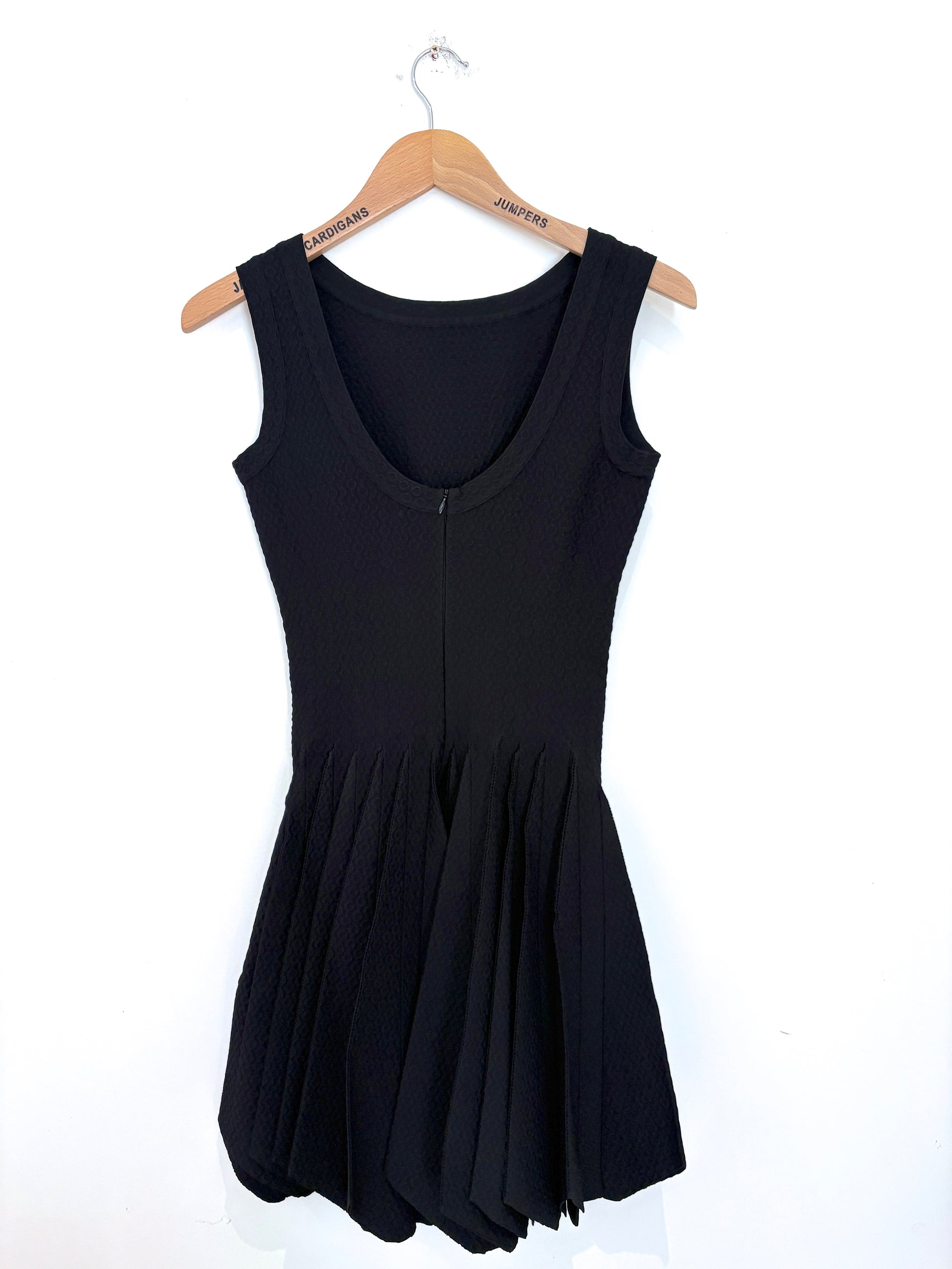 Alaia Paris black textured cocktail dress made from a heavy stretch jersey fabric for a flattering fit. Features open back and pleated skirt.