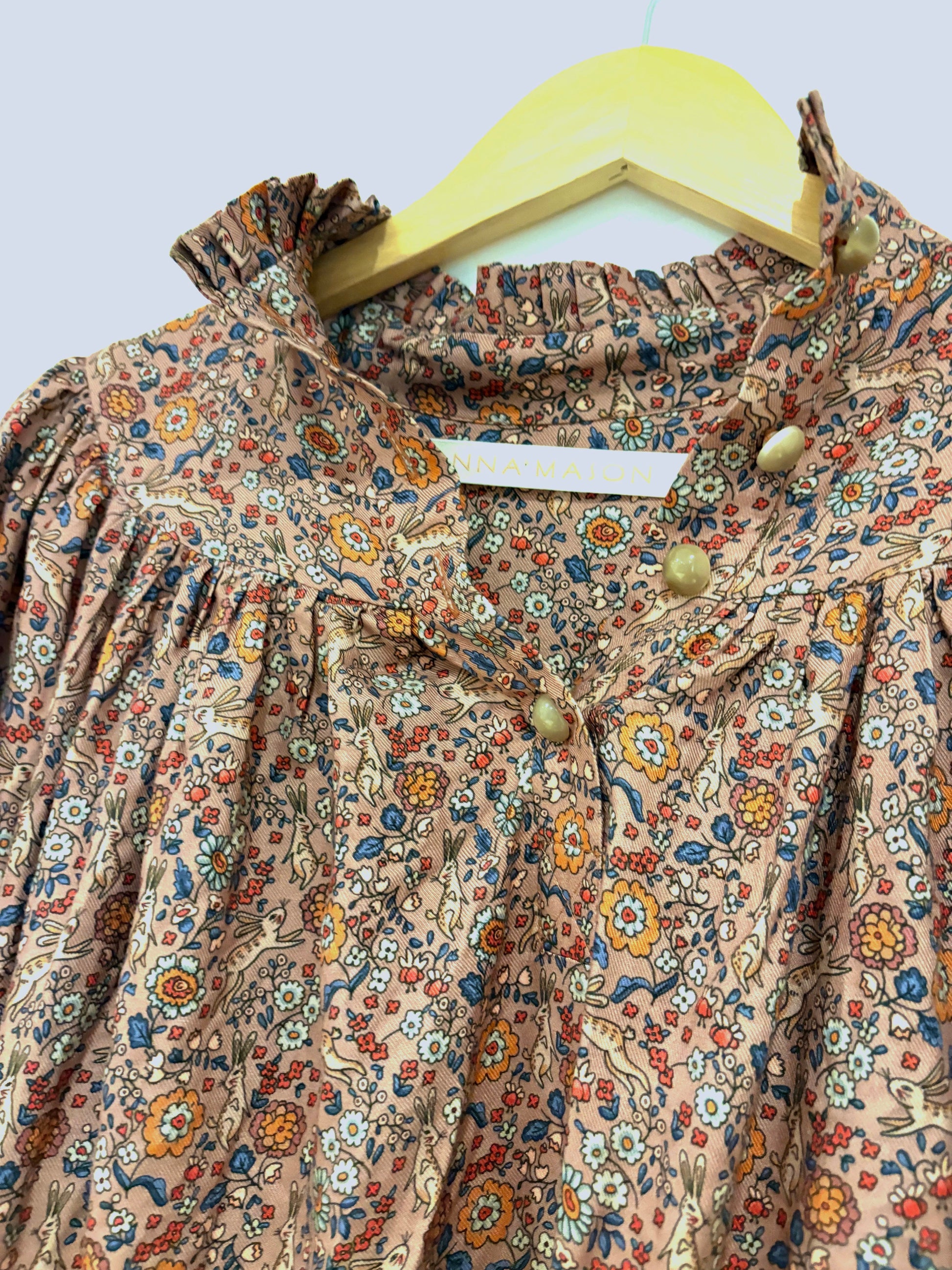 Anna Mason long-sleeve dress with soft gathers and crisp ruffle. It is cinched with a matching pleated belt which can be removed to showcase its silhouette. Long puff sleeves with button cuffs.