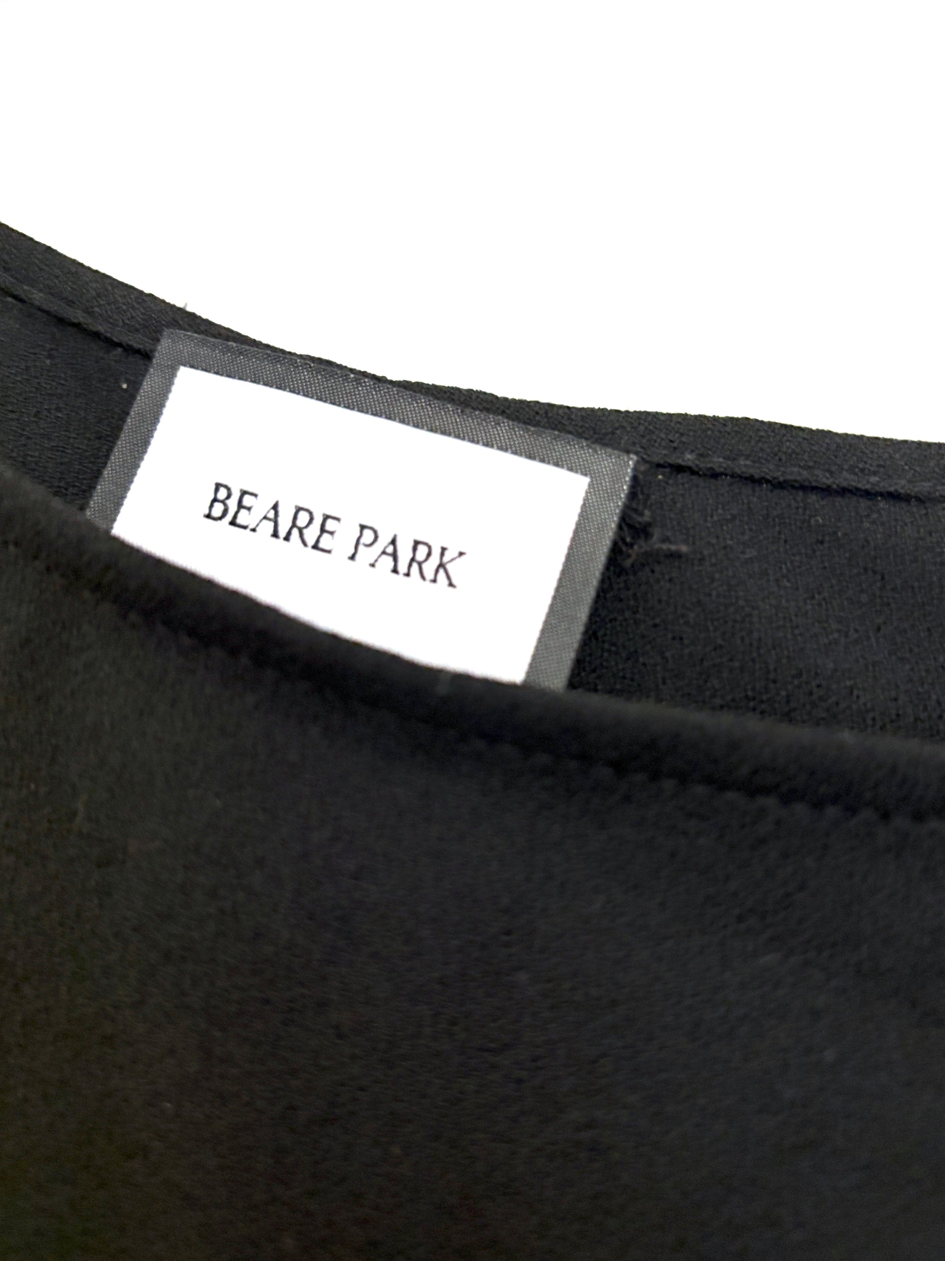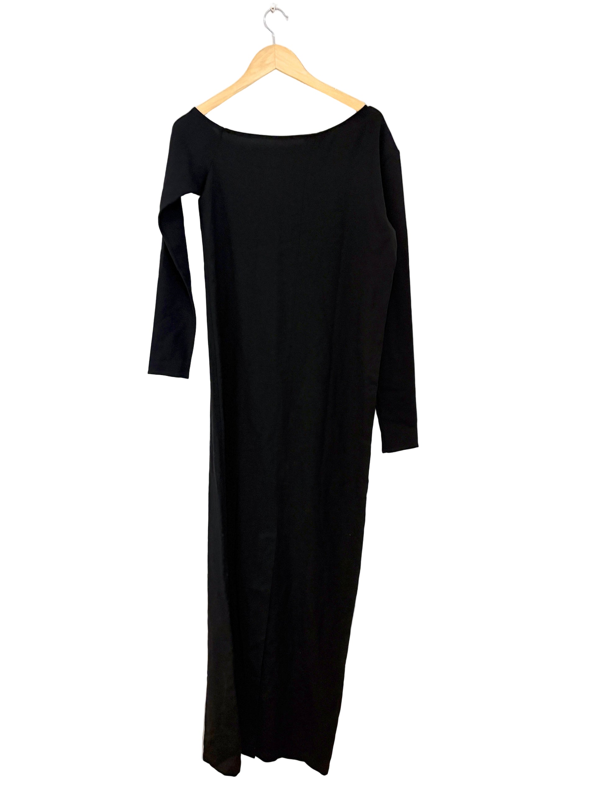 Beare Park one shoulder black wool crepe fitted maxi dress with long sleeves.