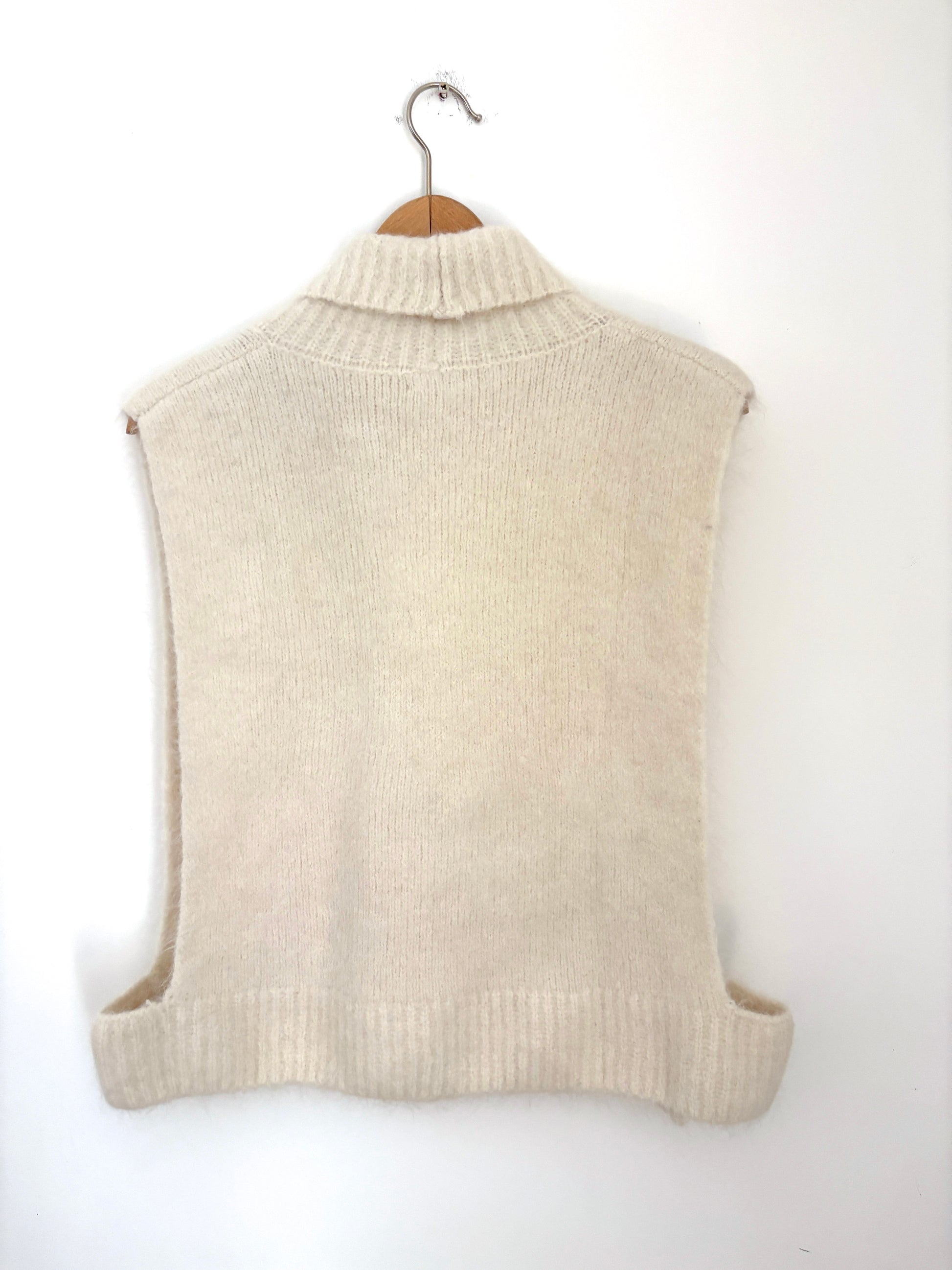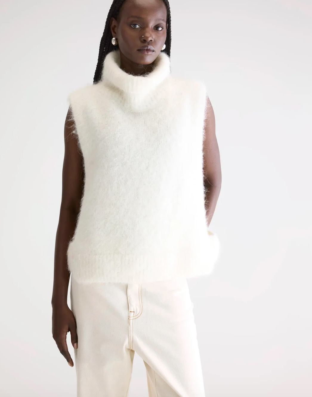 Bellerose sleeveless body warmer in beige made from alpaca blend fabric.