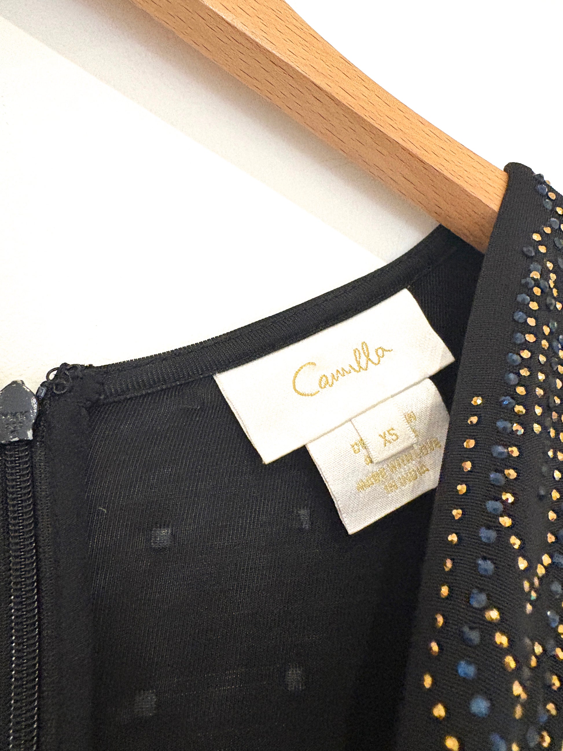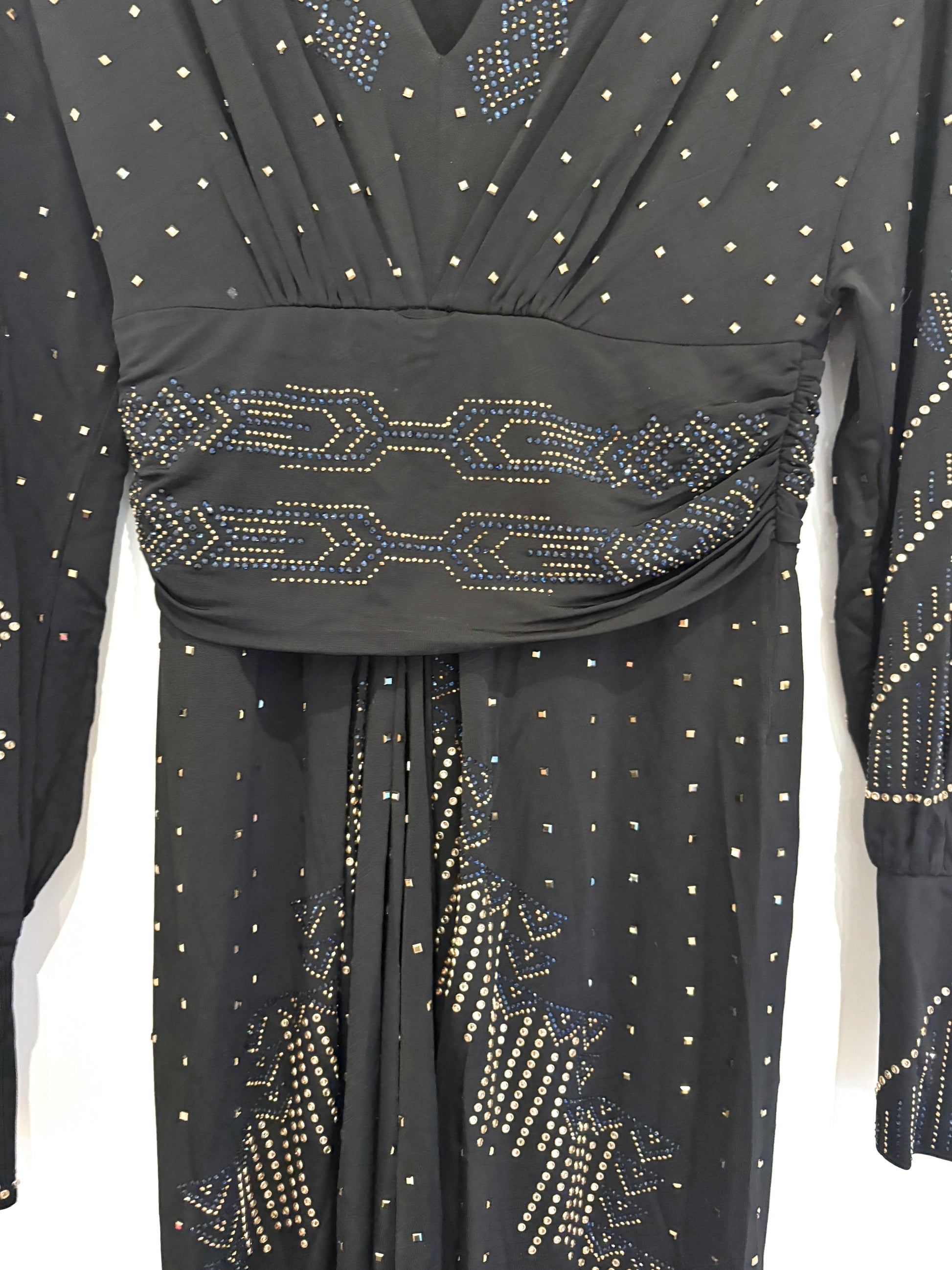 Camilla long sleeved fitted dress with gold beading, v-neckline, shoulder pads and waist belt.