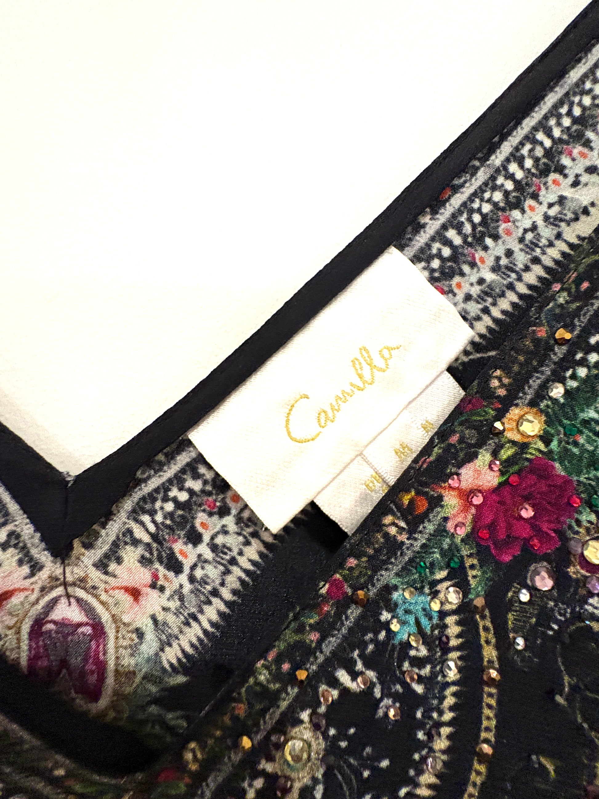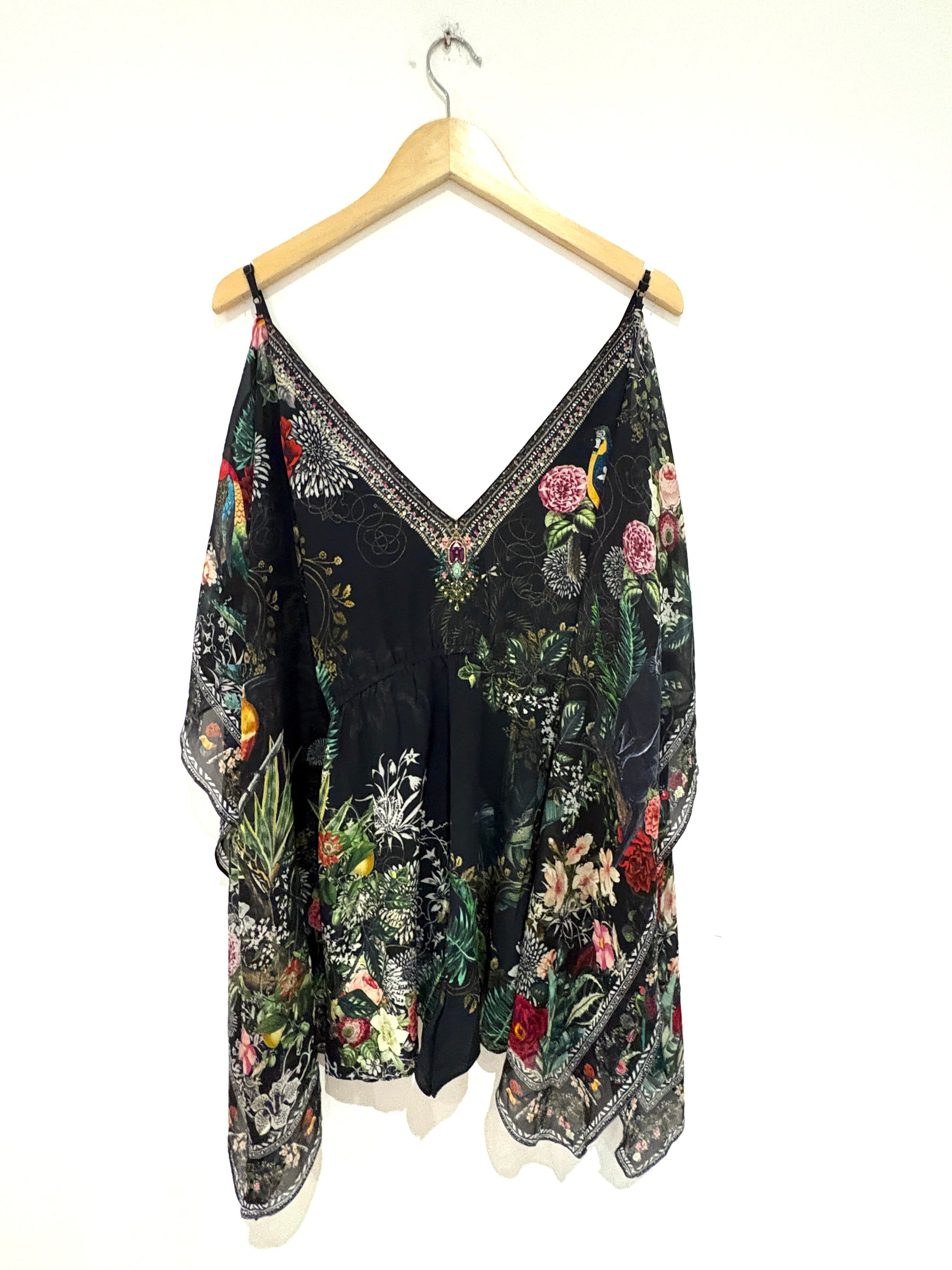 Camilla printed playsuit cut in a soft printed silk that’s spellbound with a scene of a boundless jungle, it features a floaty flared scarf side, a sweet tie back closure and is finished with a glittering array of CAMILLA crystals.