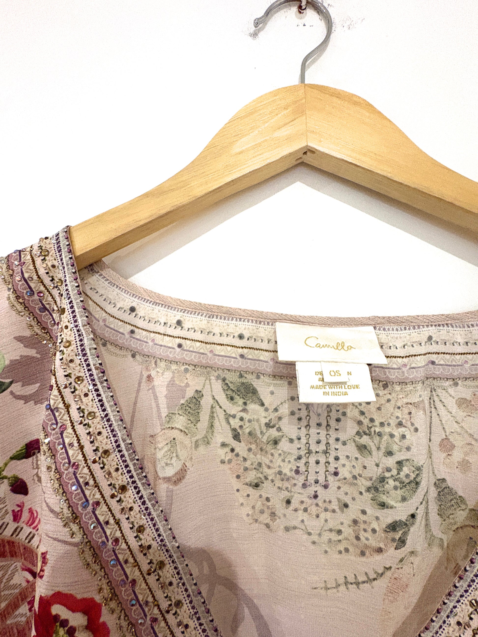 Camilla classic mini kaftan with hand painted with florals and phoenixes, this silk mini-to-midi dress features a relaxed fit, long sleeves finished with jersey cuffs, feminine v neckline and is polished with hand-applied CAMILLA crystals.