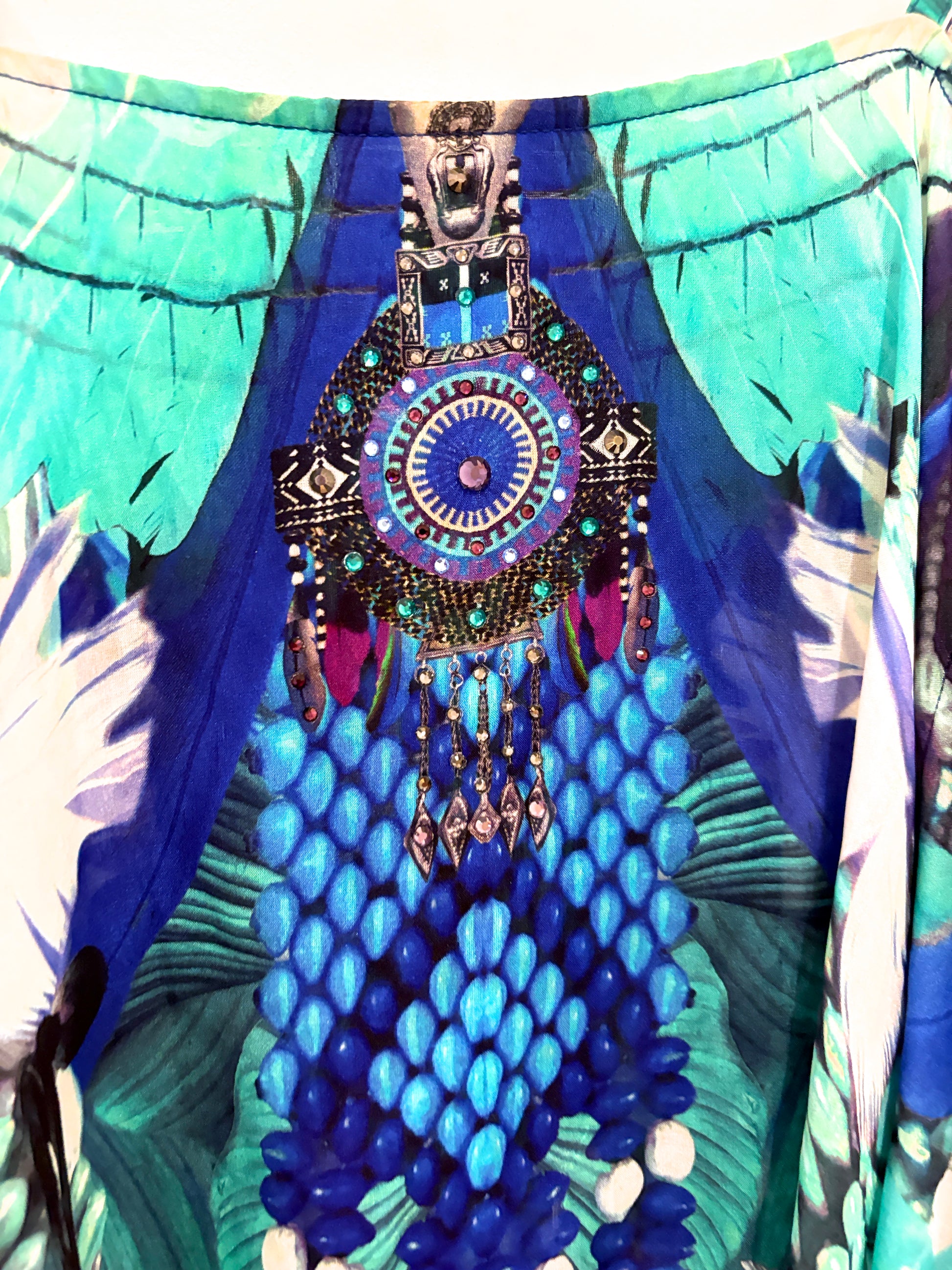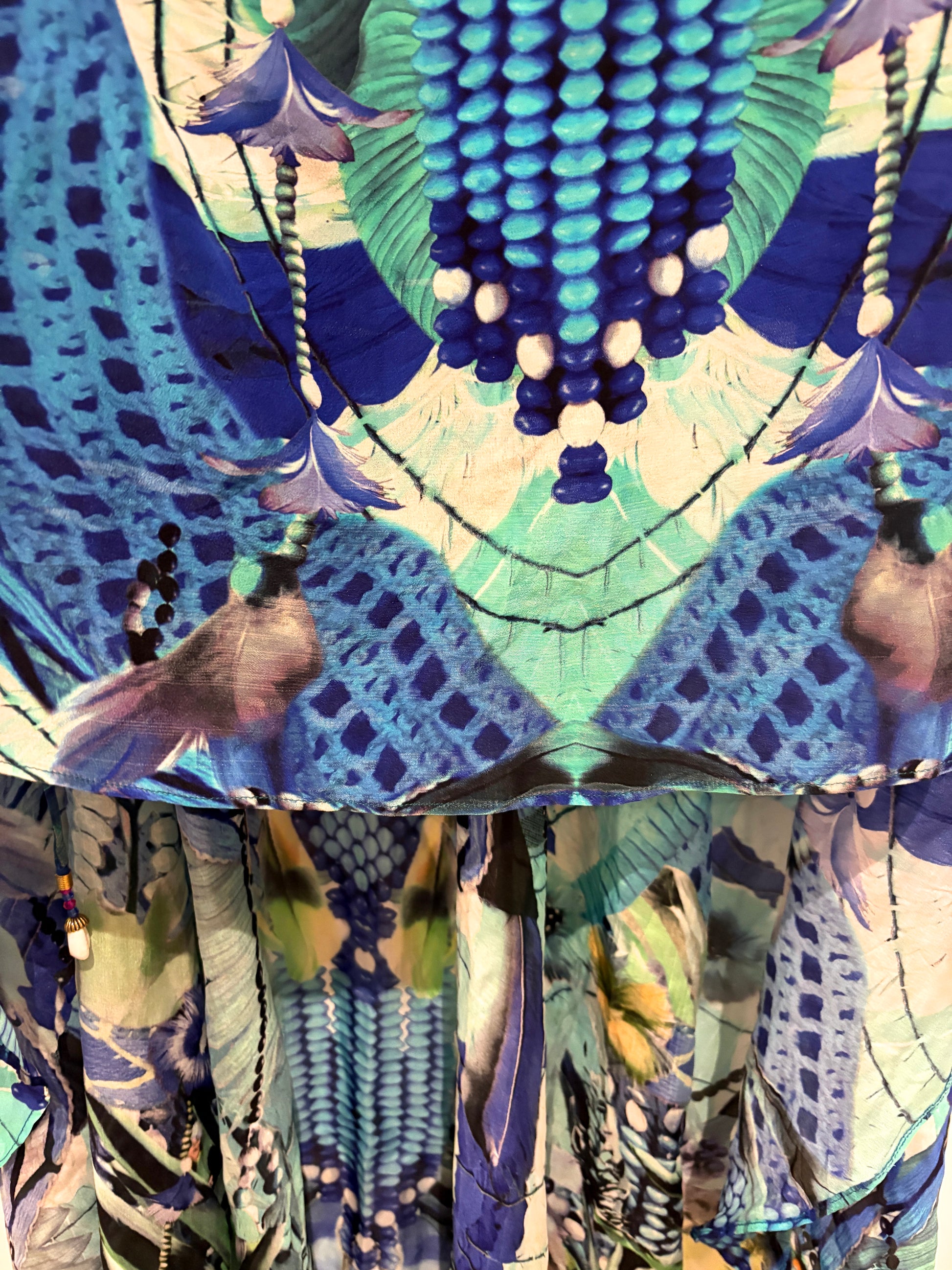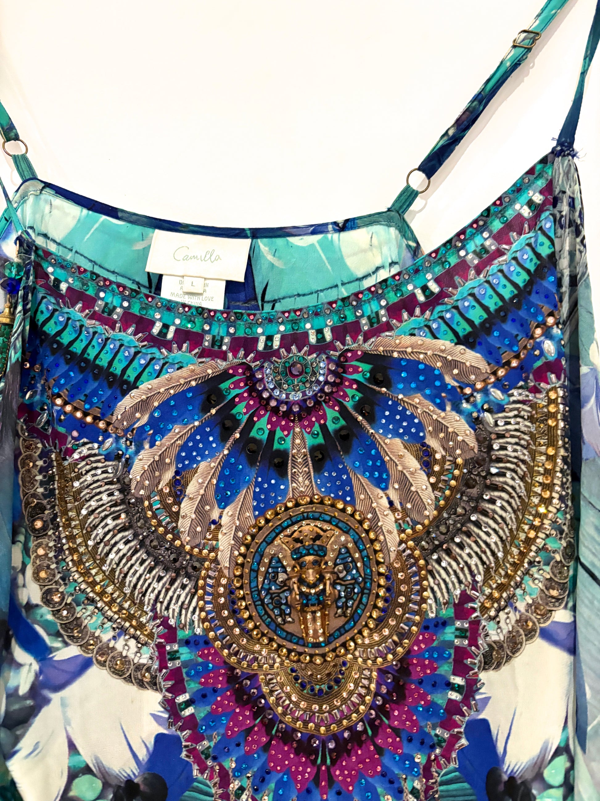 Camilla high low decorated in a striking print that radiates summery charm, this elegant silhouette will instantly refresh your whimsical wardrobe. Crystal embellishments and asymmetrical overlay at front. Shoestring straps.