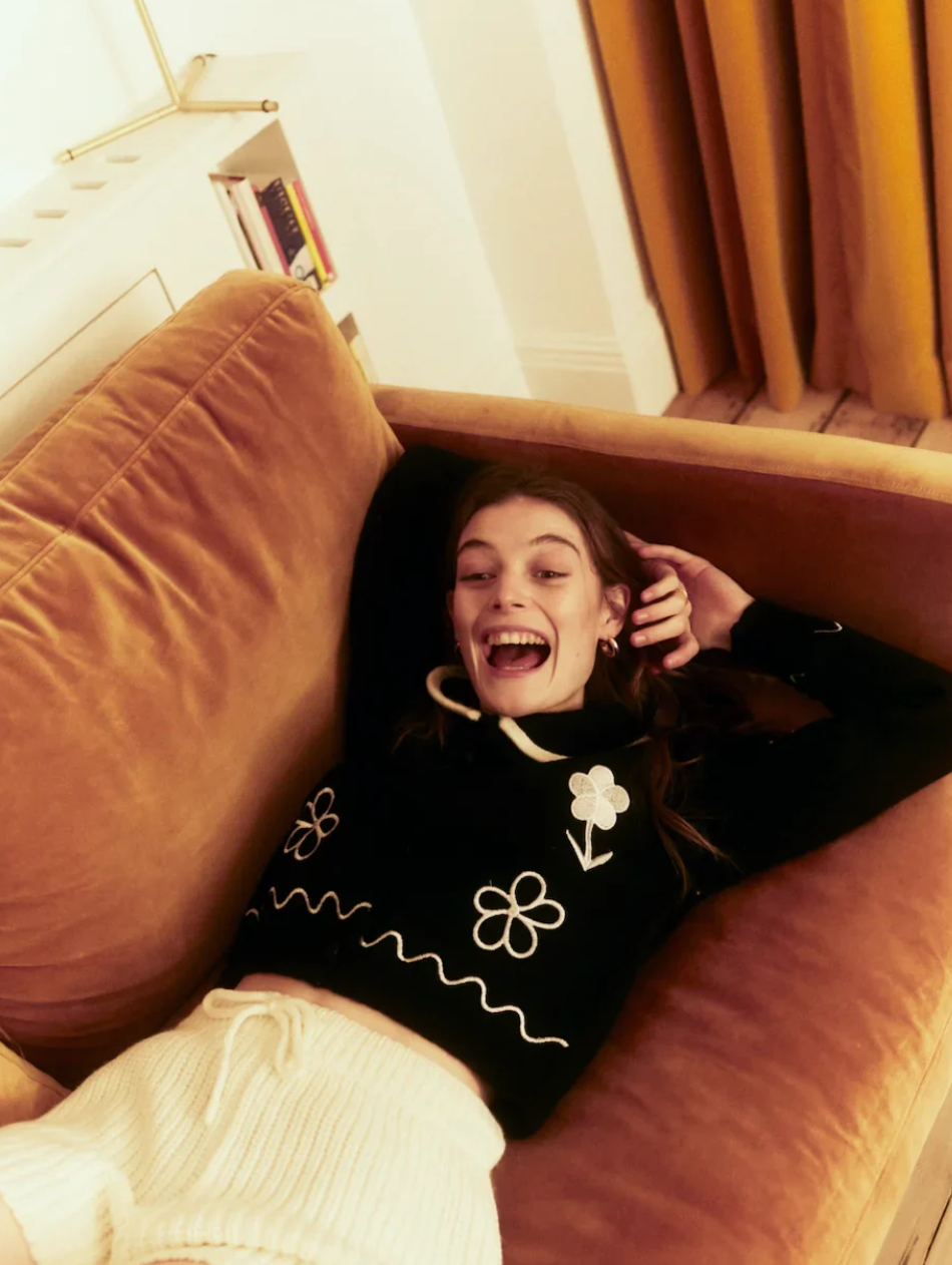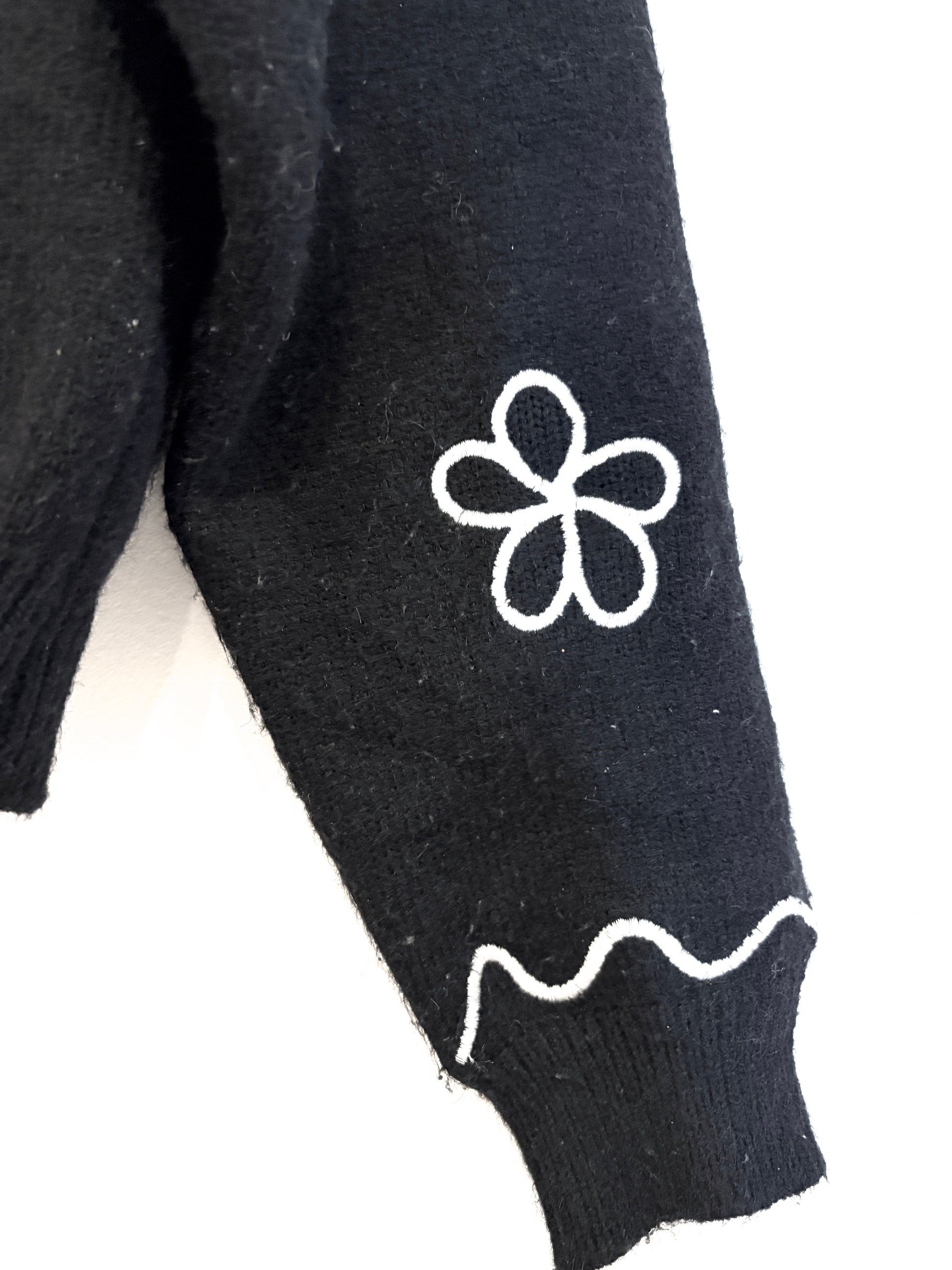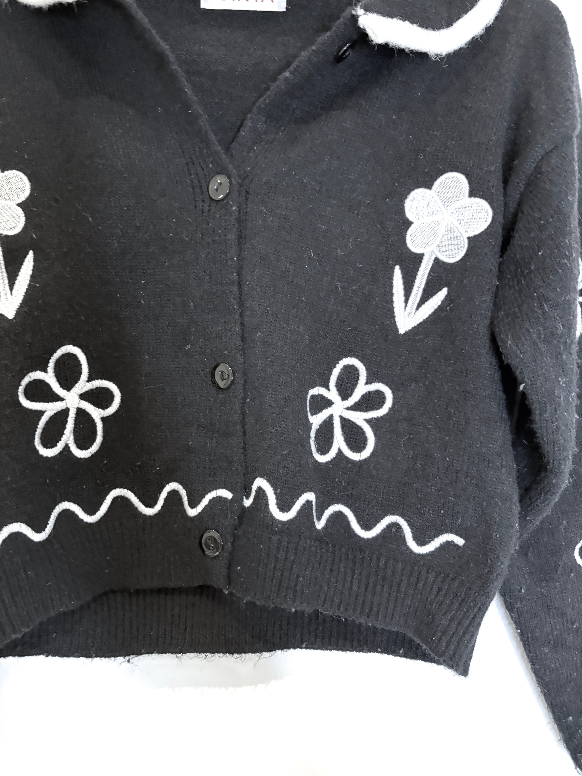 Cinta the Label short black cardigan which is made from a 70% recycled wool blend. This embroidered cardigan features a daisy and floral pattern and a 4 button-down closure.