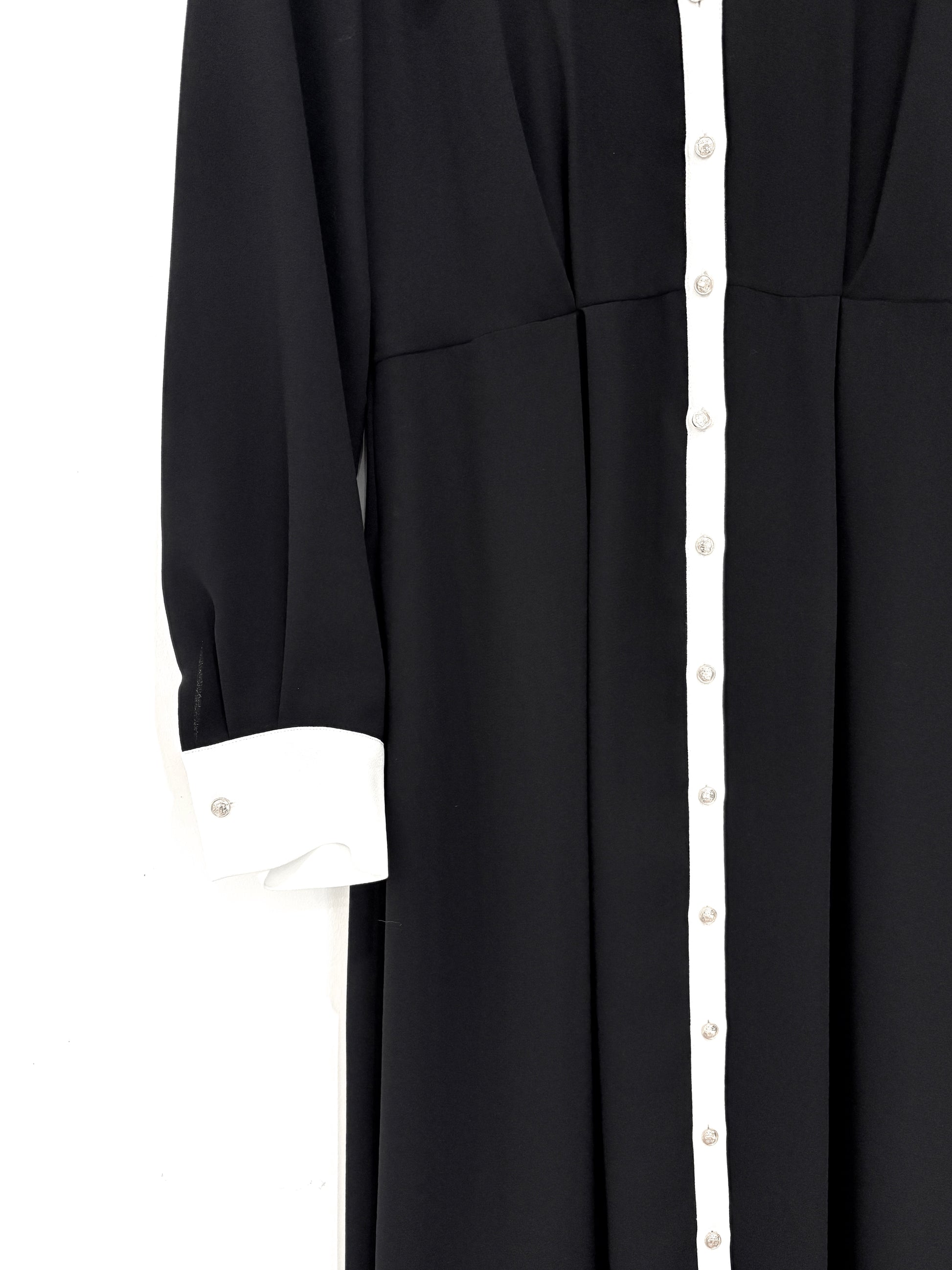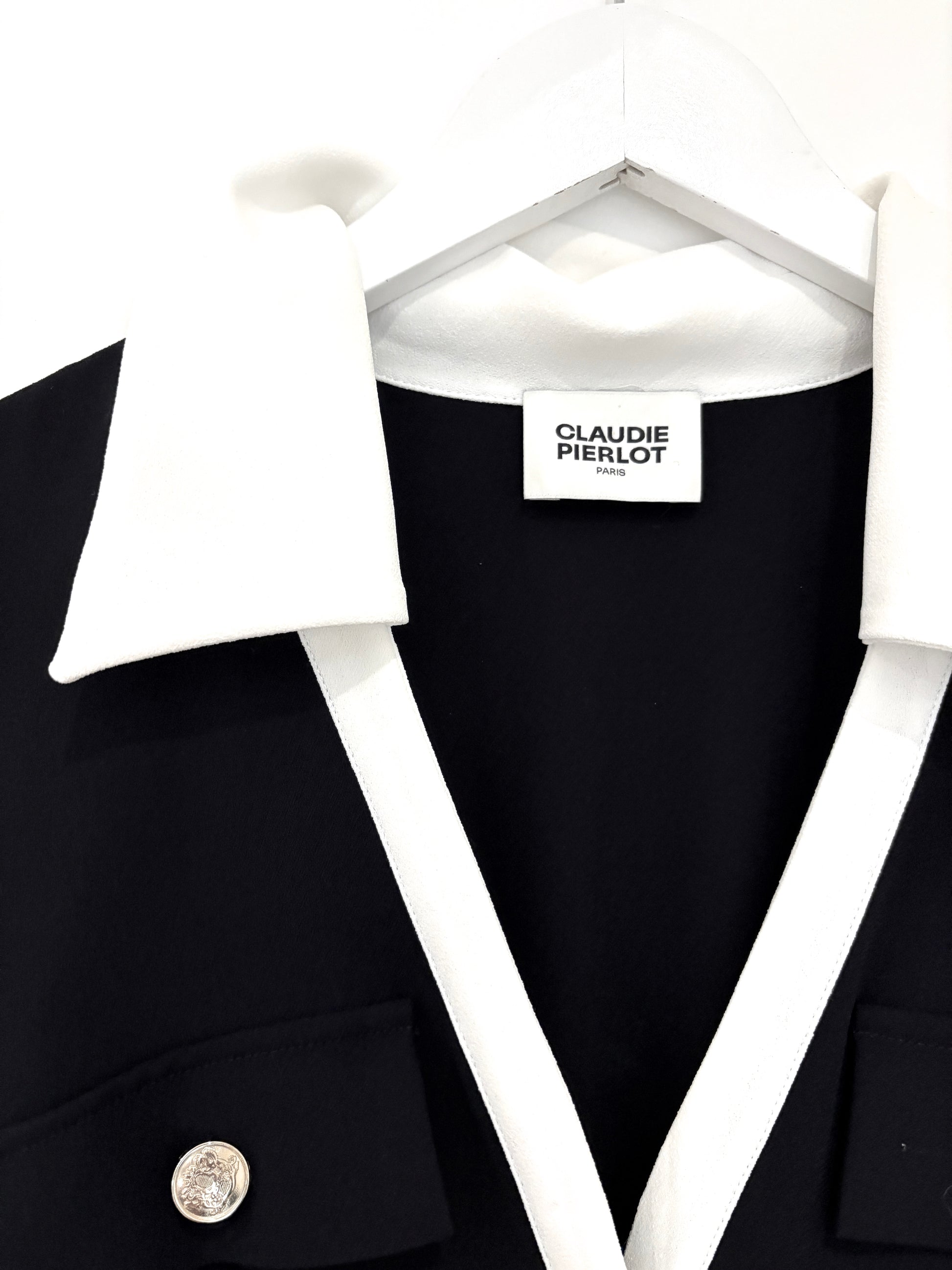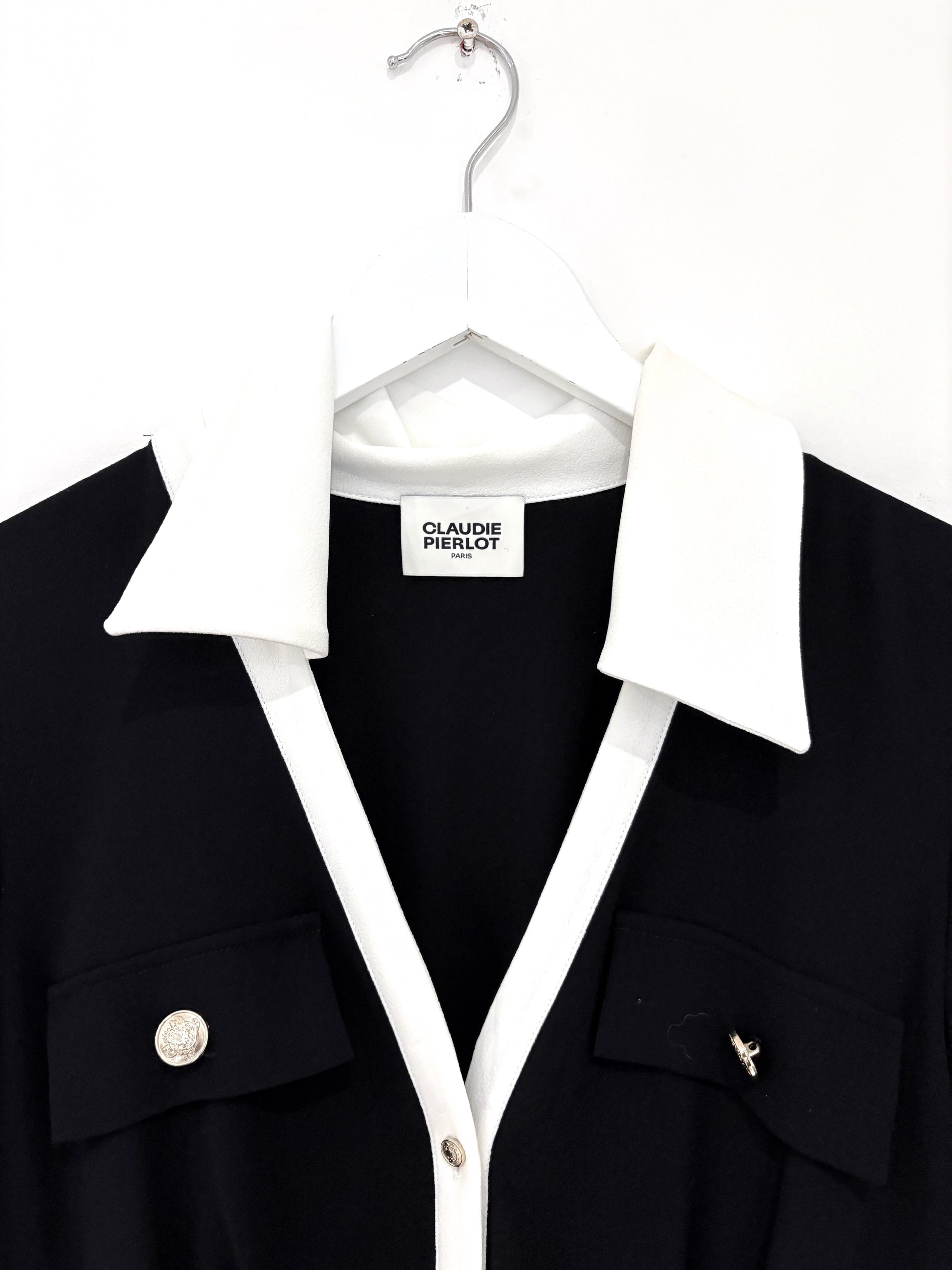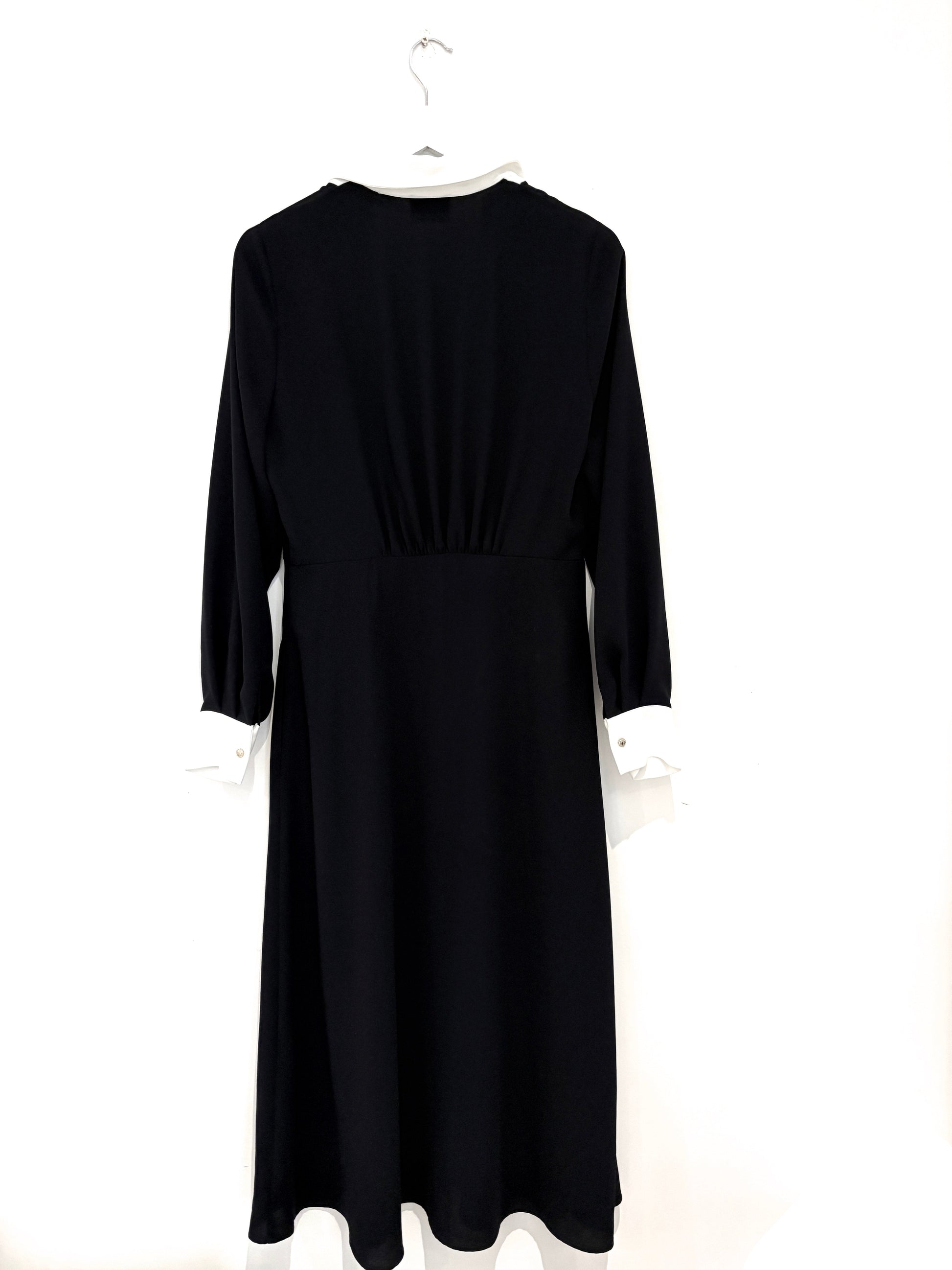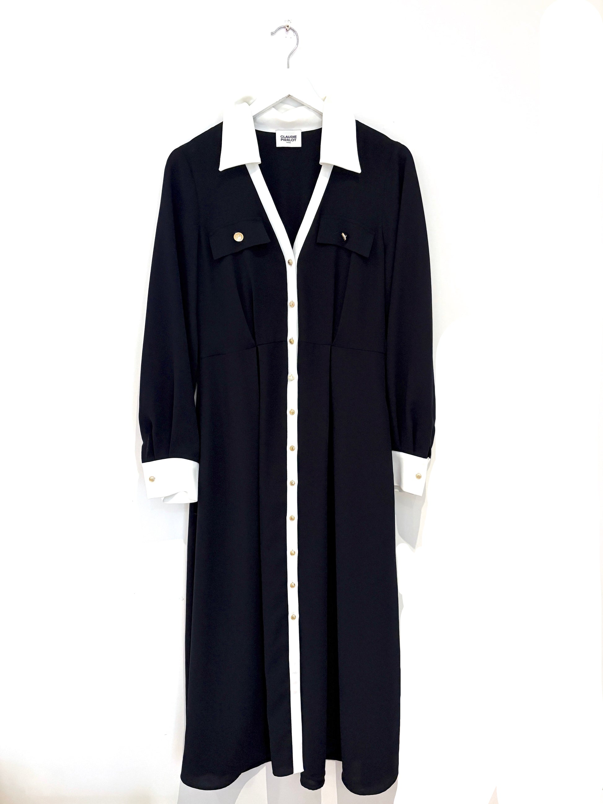Claudie Pierlot dark navy maxi dress with contrast white collar and cuffs. Features long sleeves and button-down fastening.