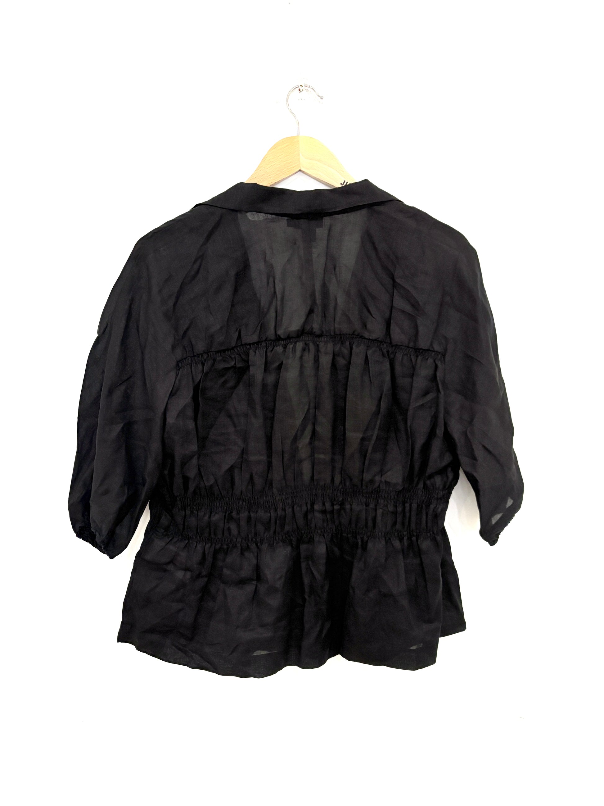 DKNY black peplum linen blouse with lapel v-shaped collar, cinched waist, large front pockets and 3/4 sleeves with elasticated cuffs.
