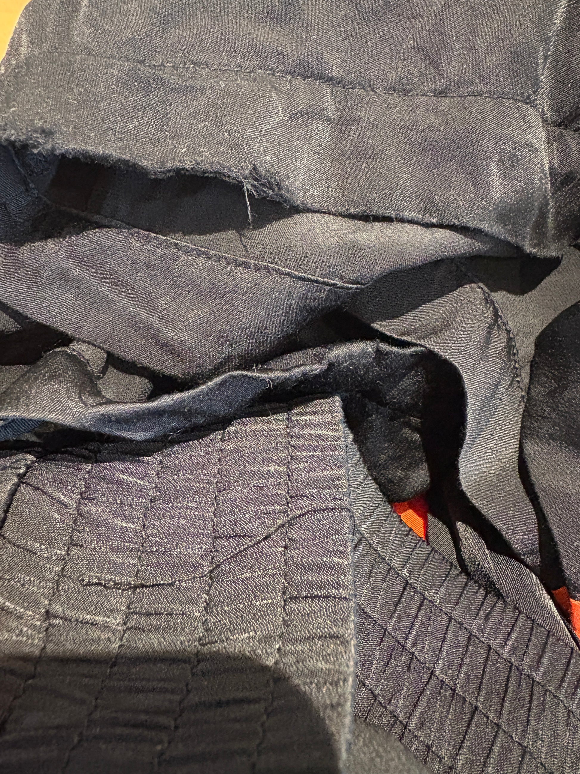Ghost wide leg silky trousers with stretch waistband and orange stripes down the sides.