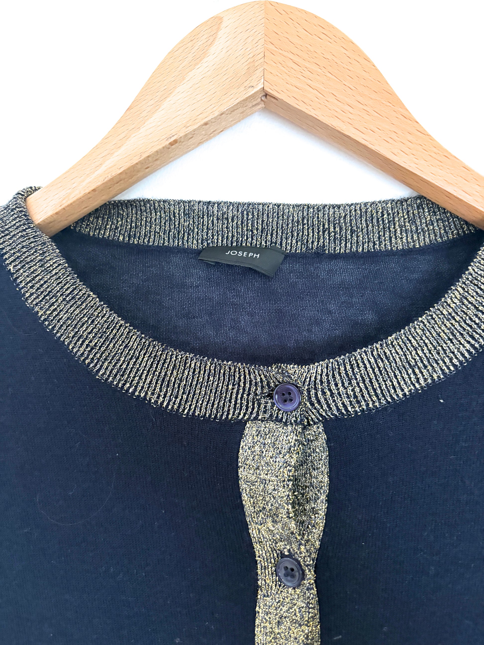 Joseph navy cashmere cardigan with gold neckline and trimmings.