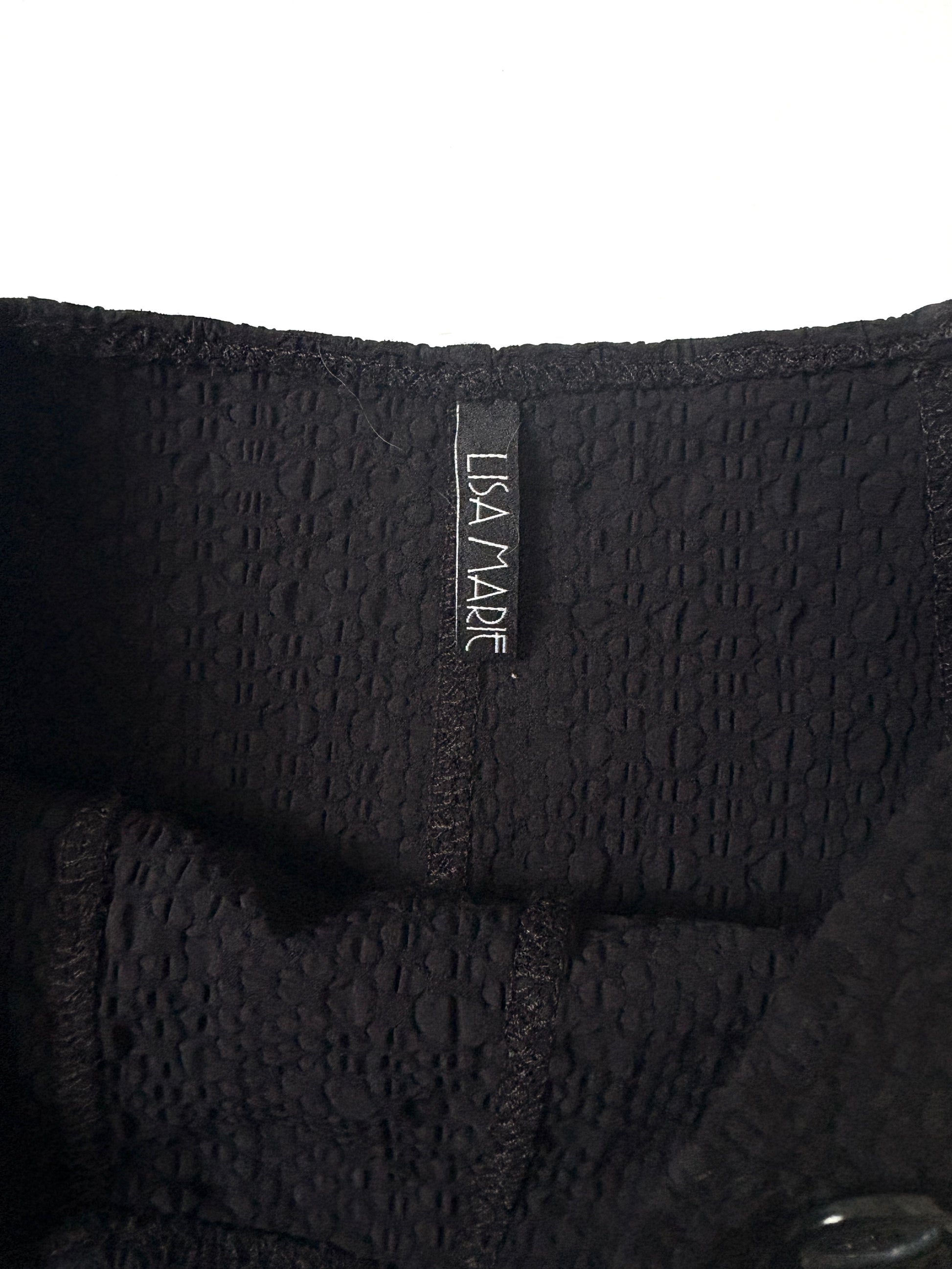 Lisa Marie Fernandez textured black bikini with bandana bow front top and matching high waisted briefs. Frayed Edges.
