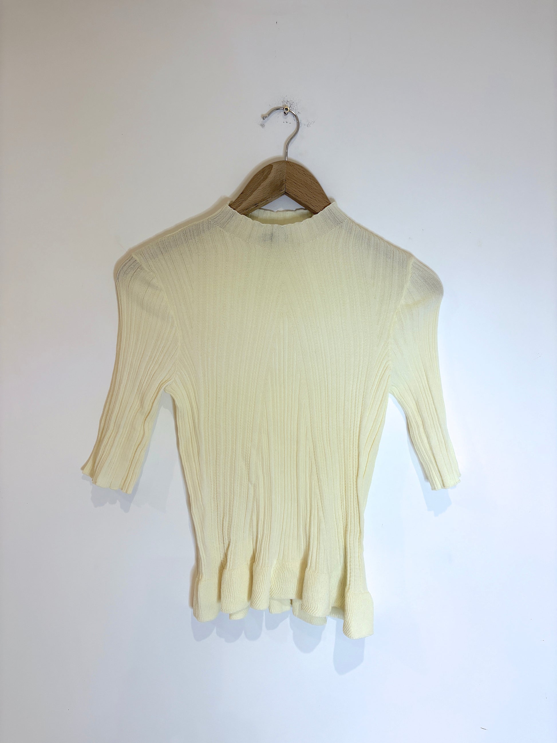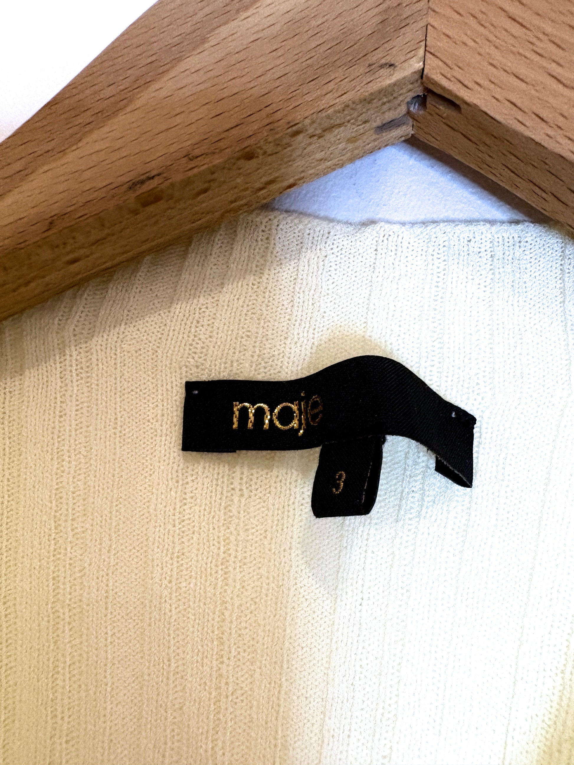 Maje ribbed-knit in cream with ruffled trims made from a light weight knit.