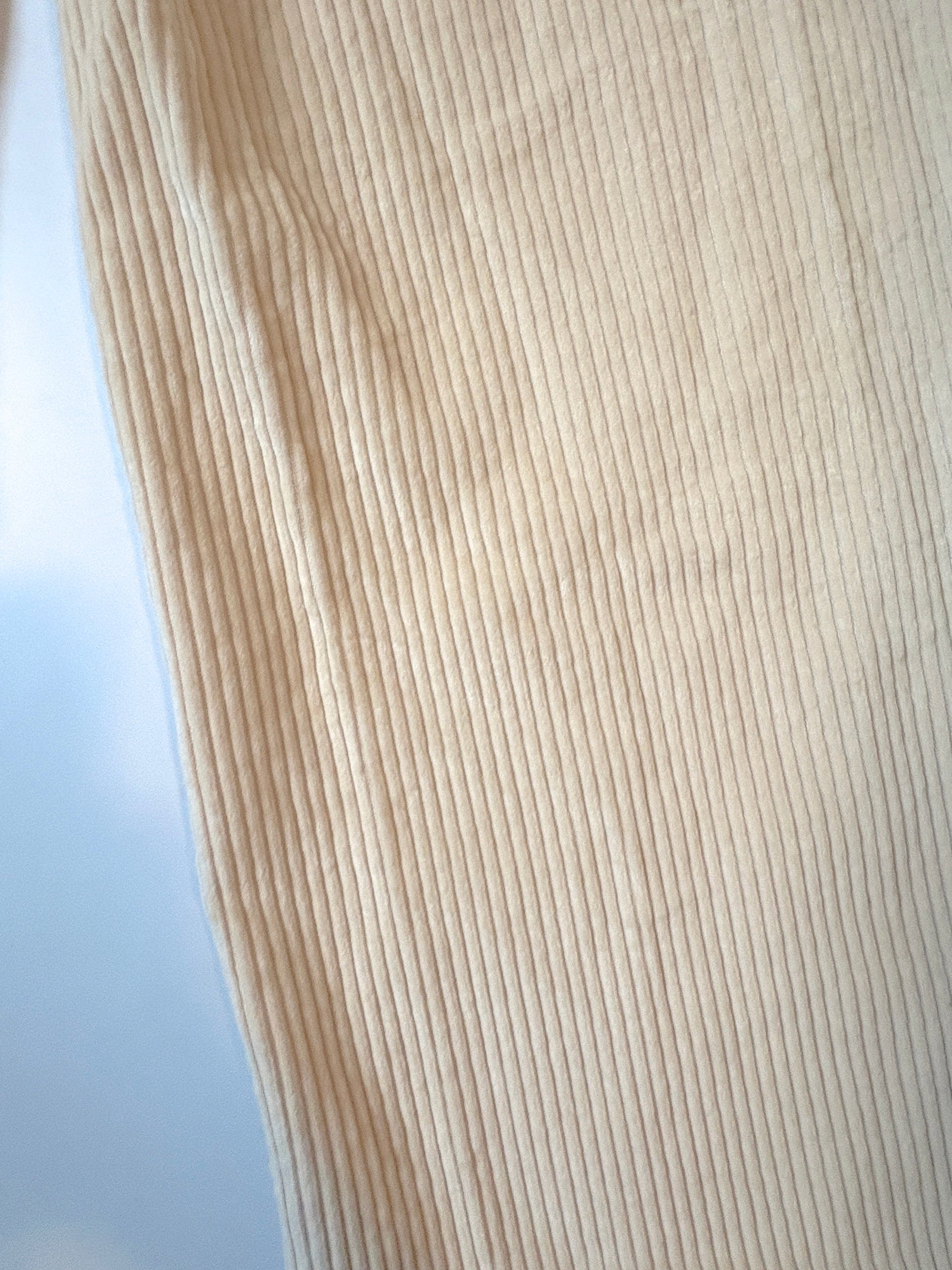 Maria de la Orden high-waisted and wide-legged pants in cream corduroy with MDLO engraved buttons,