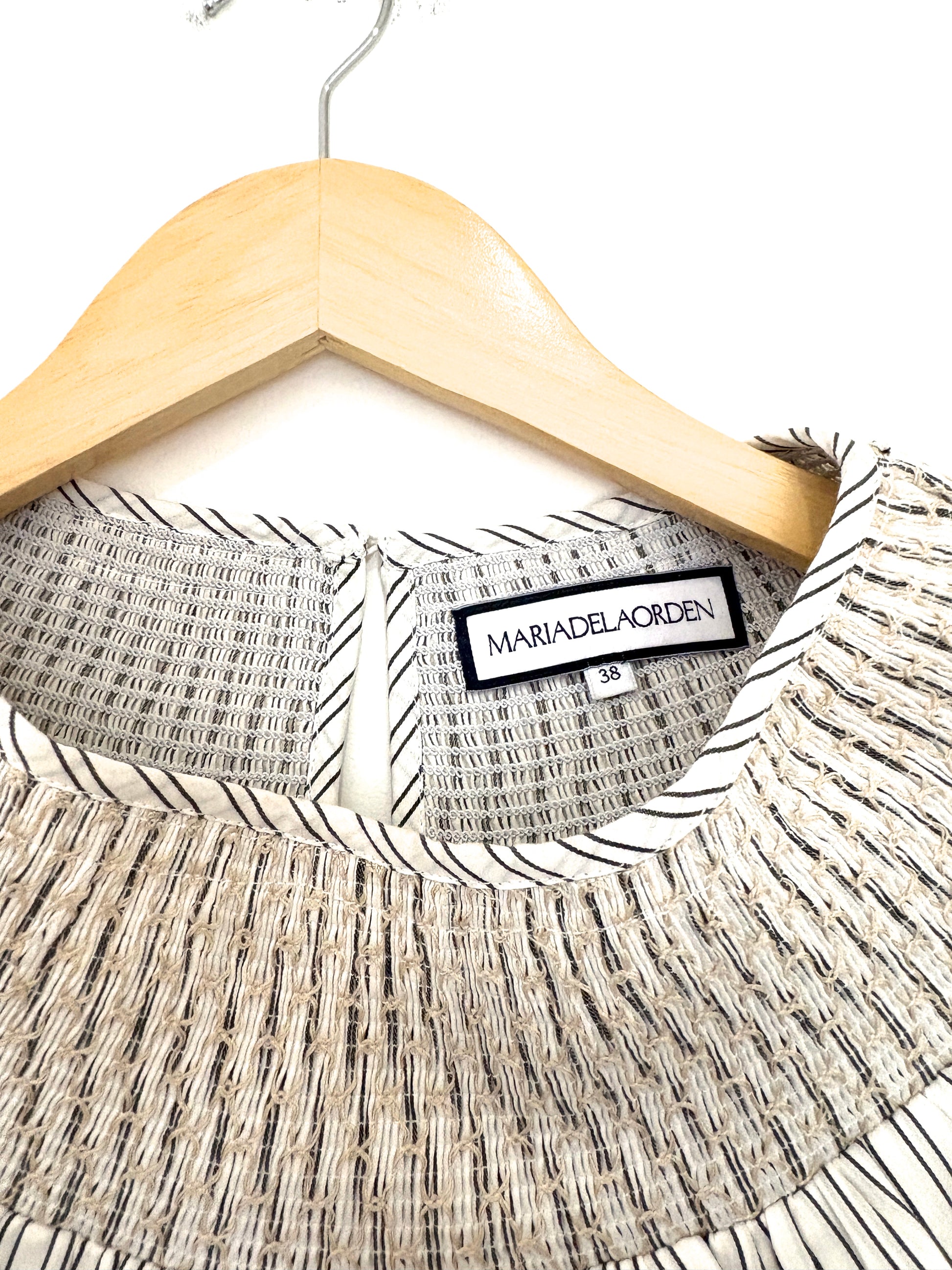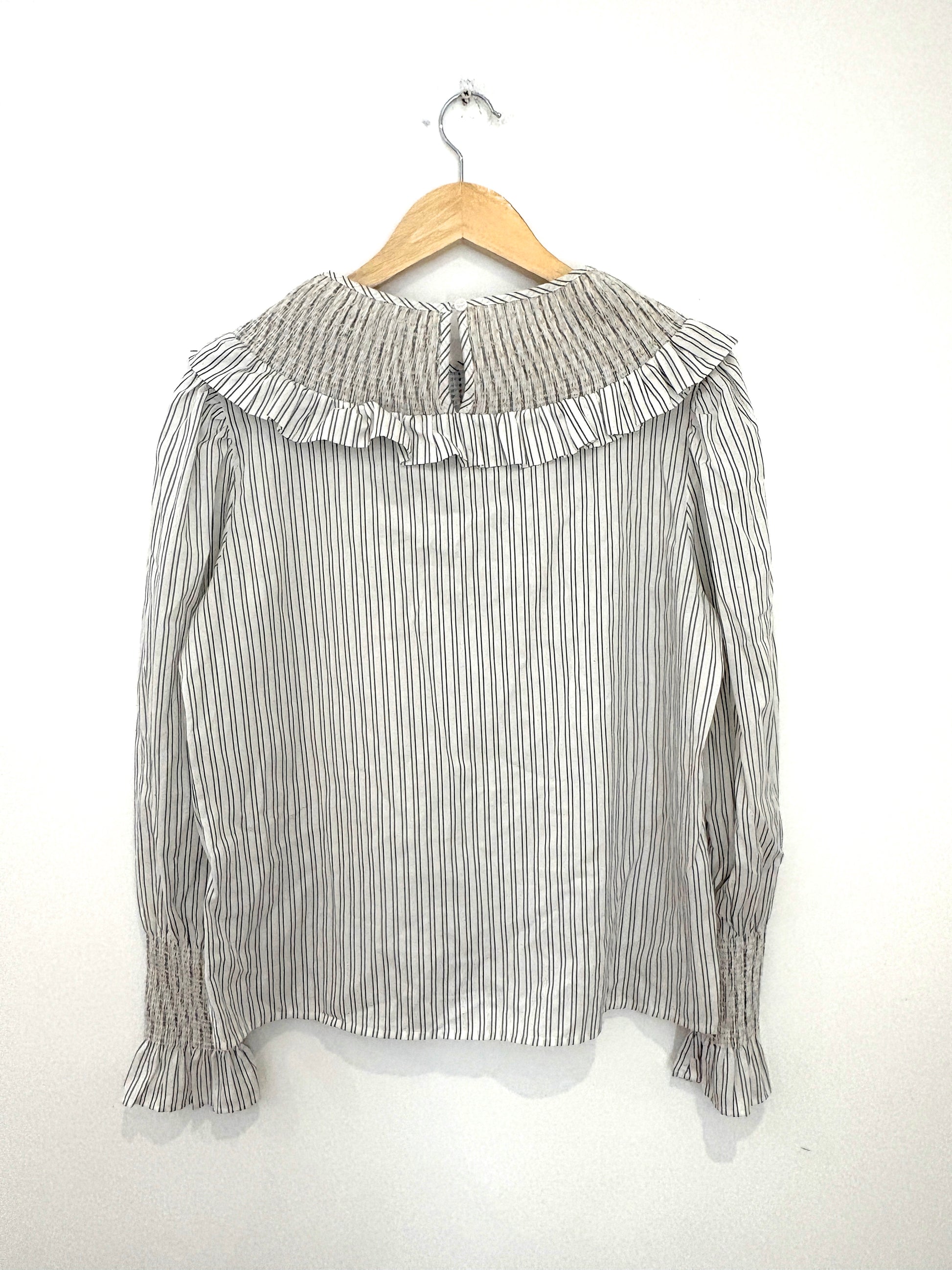 triped black and white cotton shirt with a large ruffled collar and beige smocking.