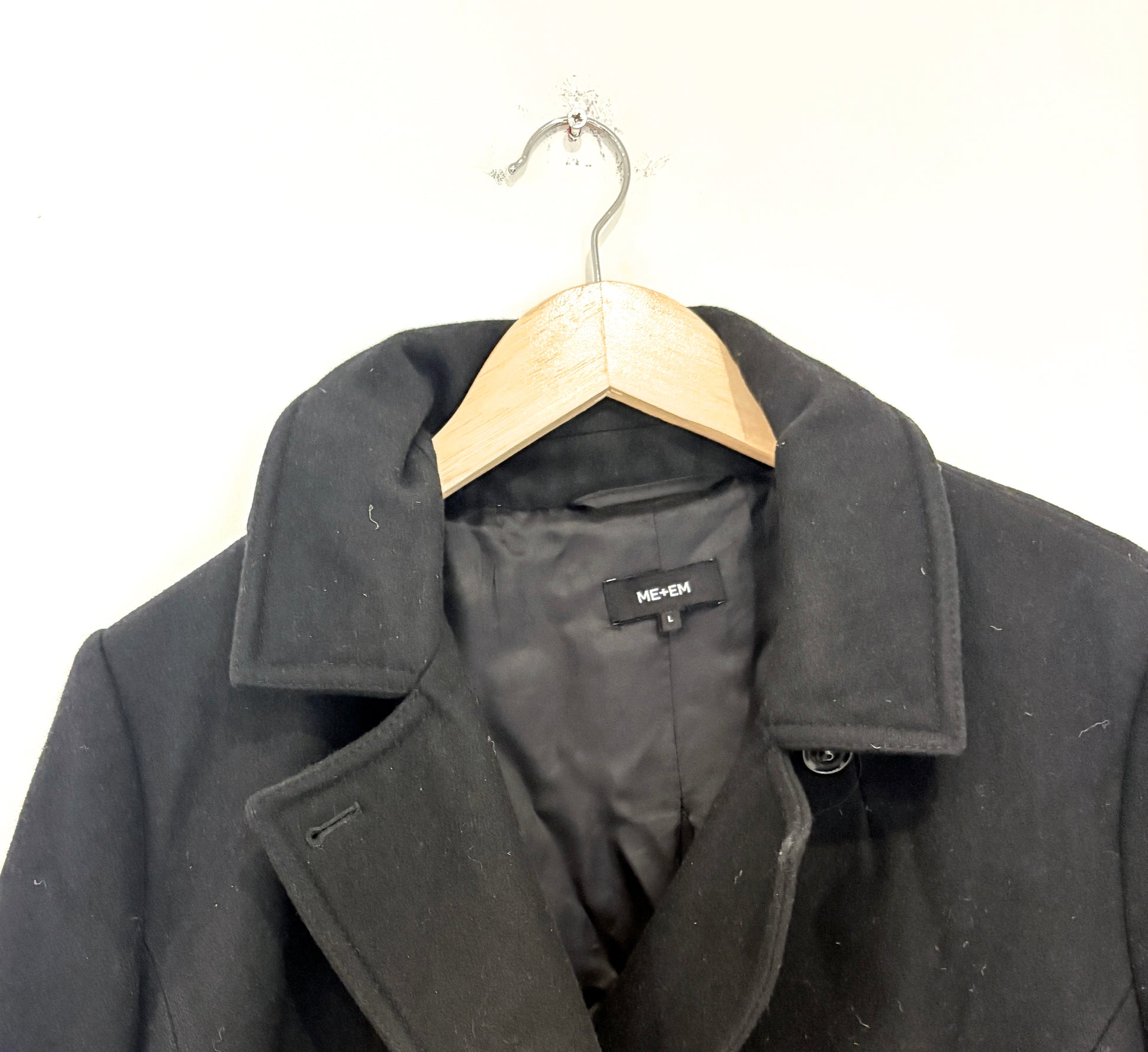 Me+Em black wool pea coat with lapel collar and double breasted buttoned fastening.
