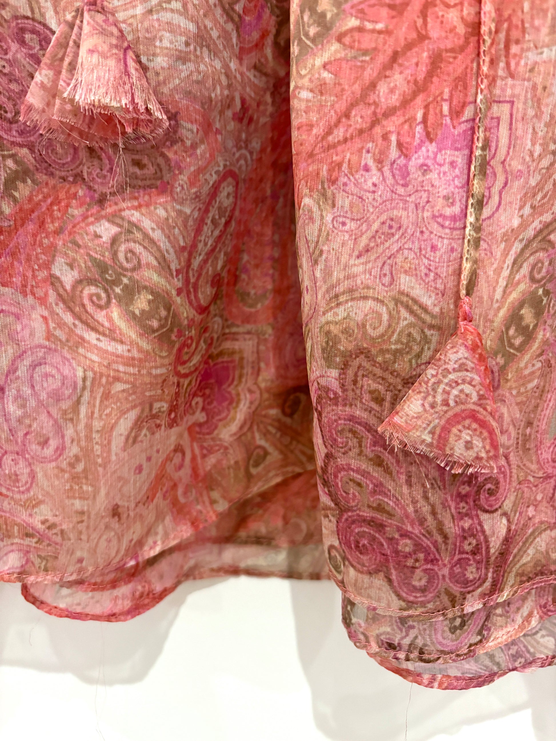 Misa Los Angeles sheer print pink blouse with ribbed cuffed sleeves.