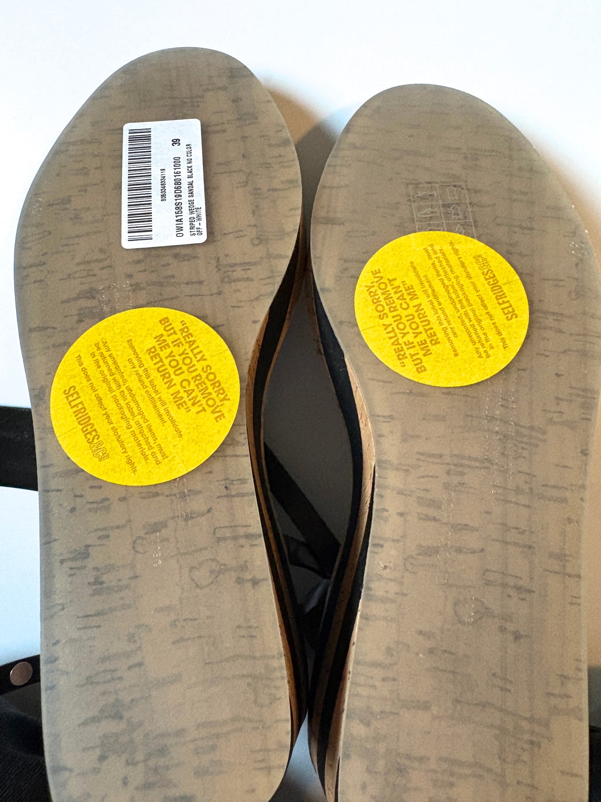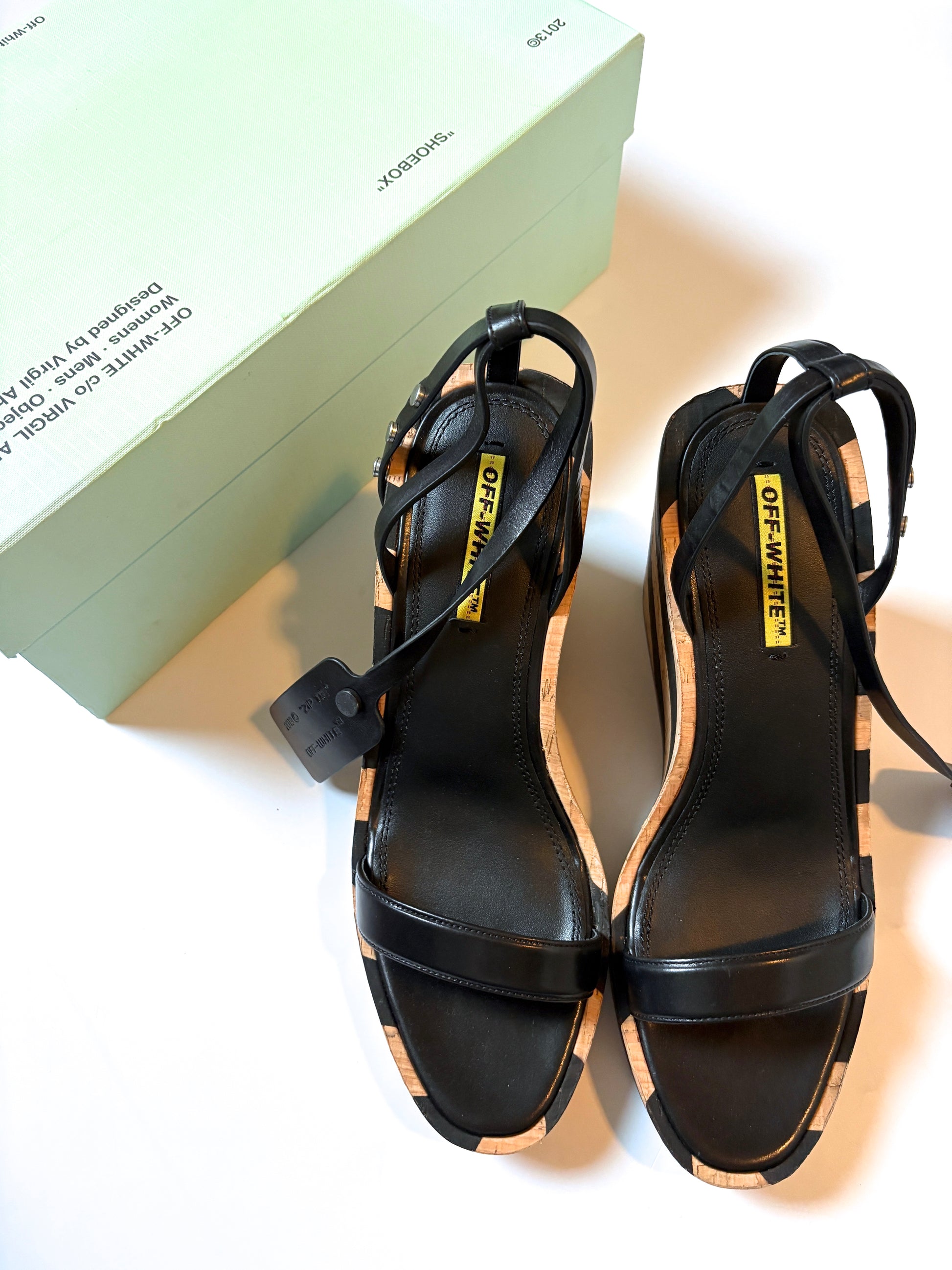 Off-white leather and cork striped platforms with multi strap and snap closure at the ankles.