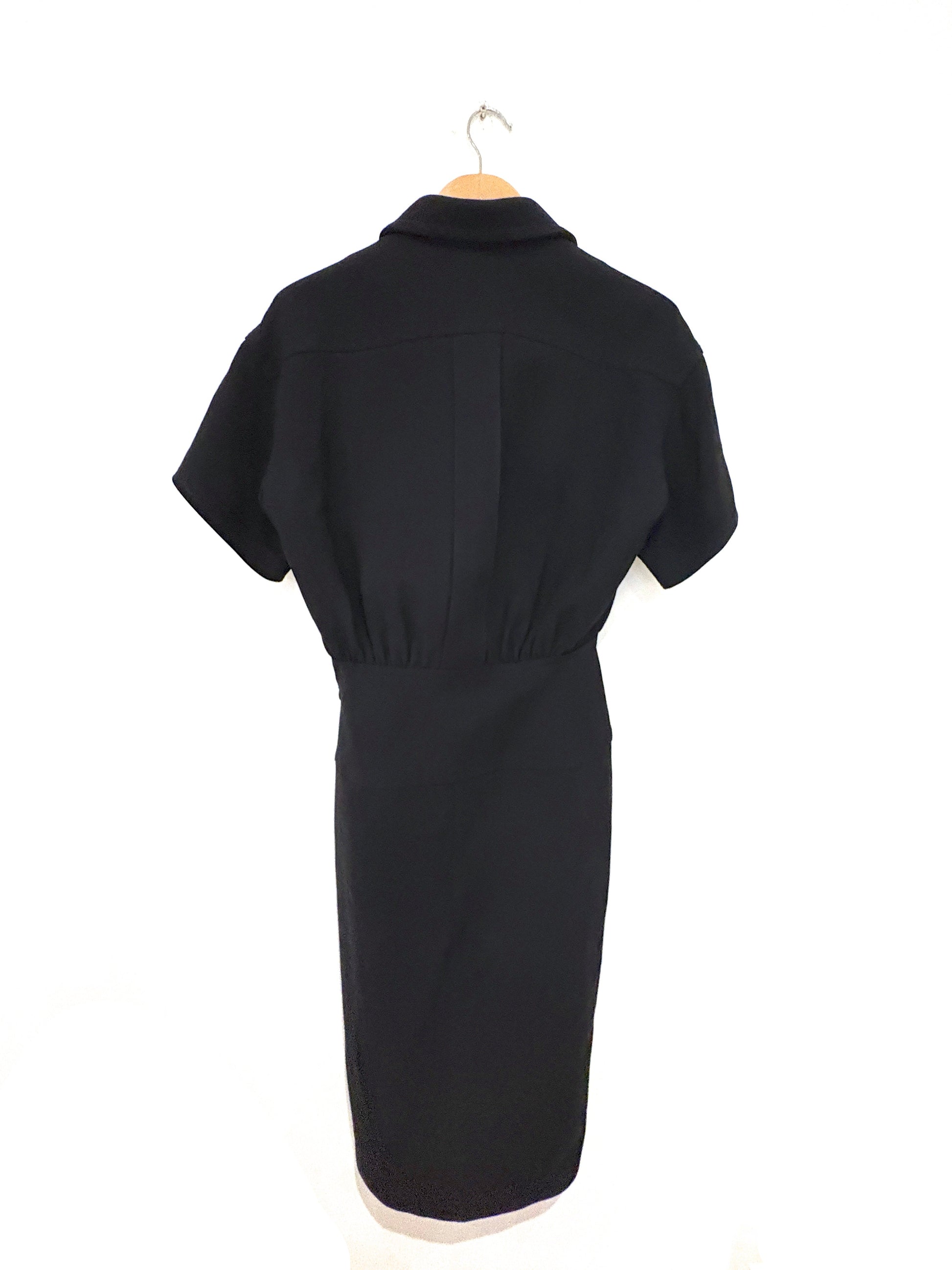 Courrèges black buttoned midi dress made from a heavy lined fabric. Features front pockets and buttoned fastening.