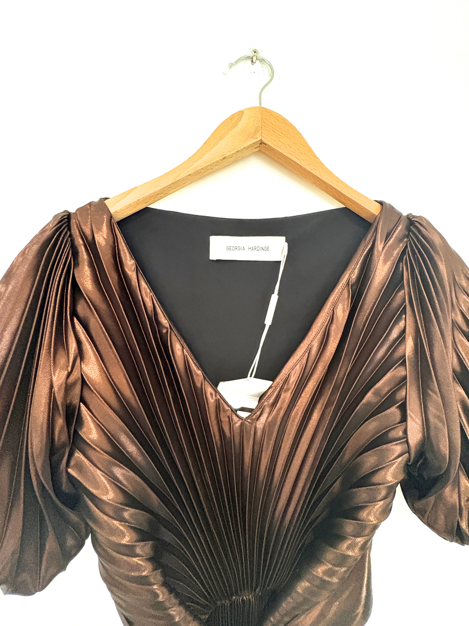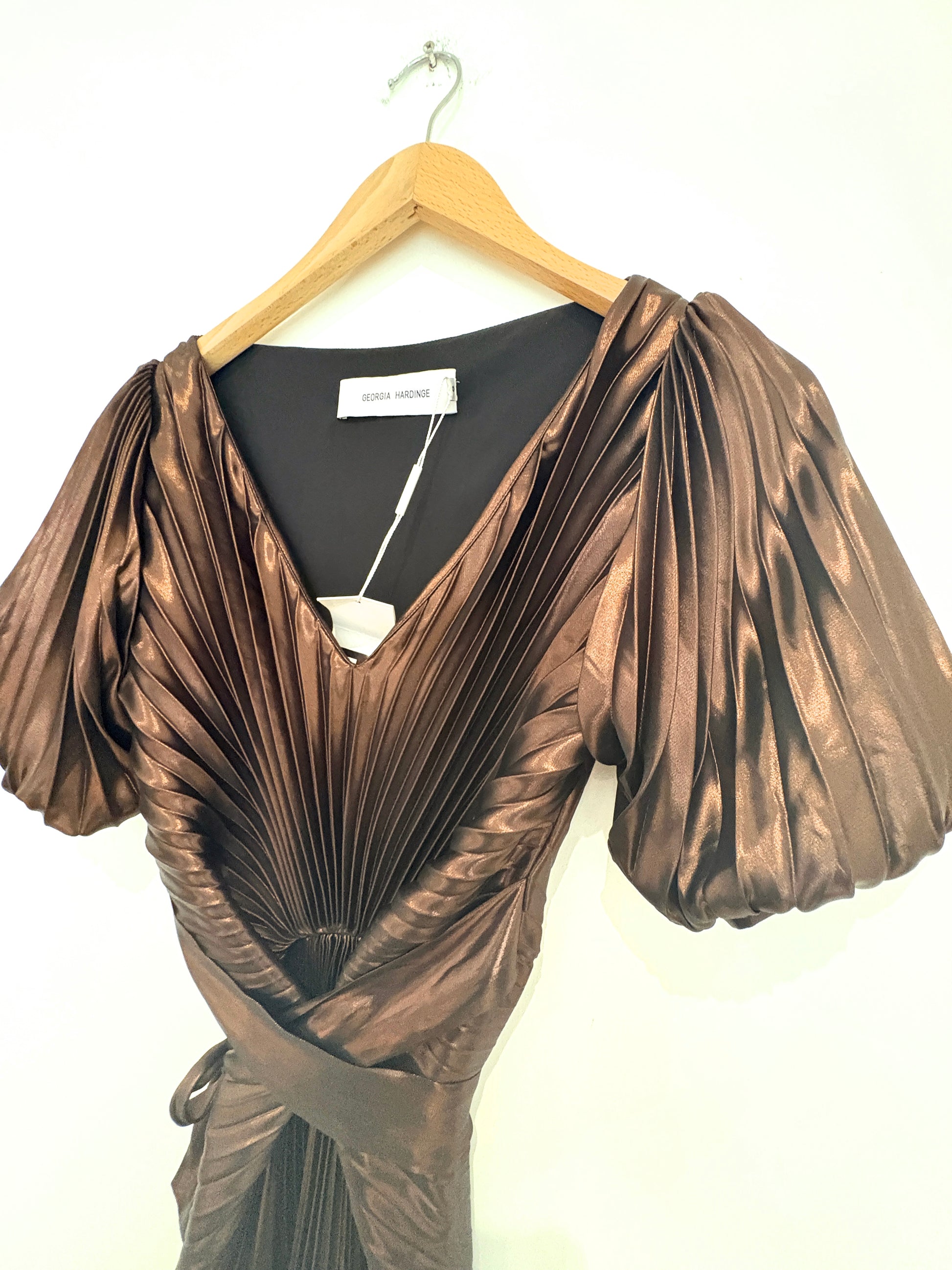 Georgia Hardinge bronze pleated party dress with gathered detail on the waist, asymmetric hemline, small puff sleeve and belt that ties up at the front or back. Made from a soft, liquid metallic chiffon.