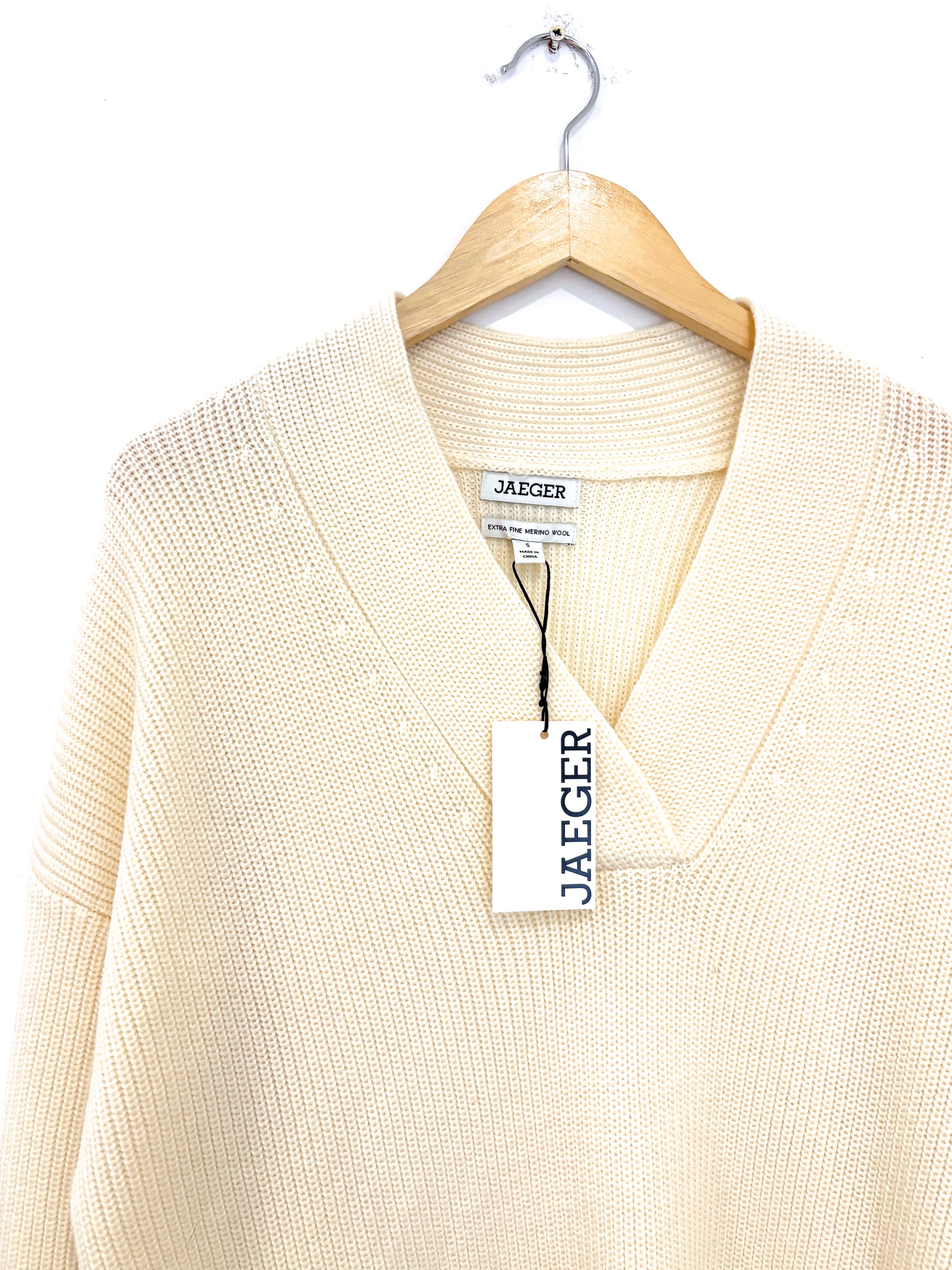 Jaeger 100% merino wool ribbed jumper dress in cream with v-neckline.