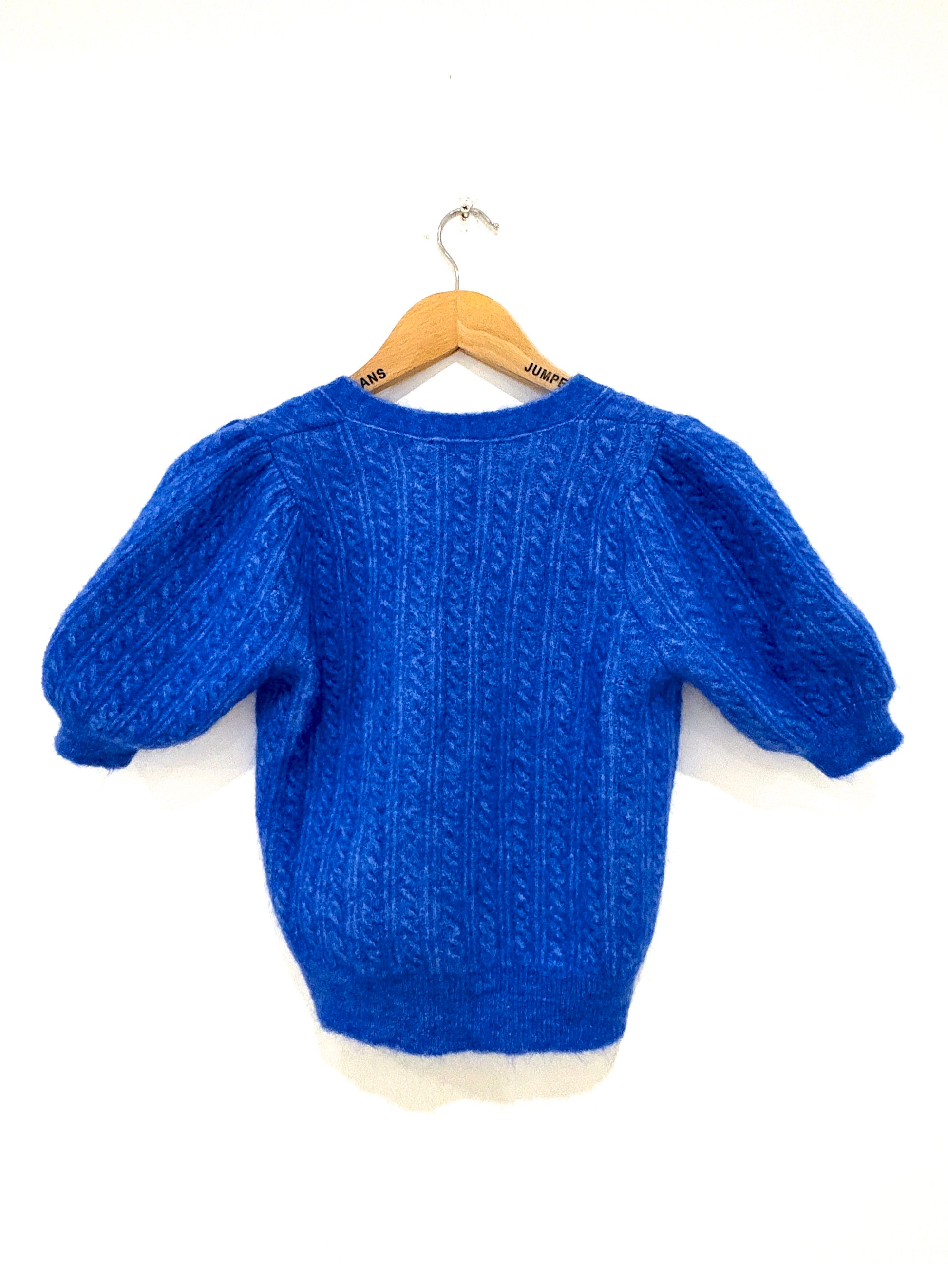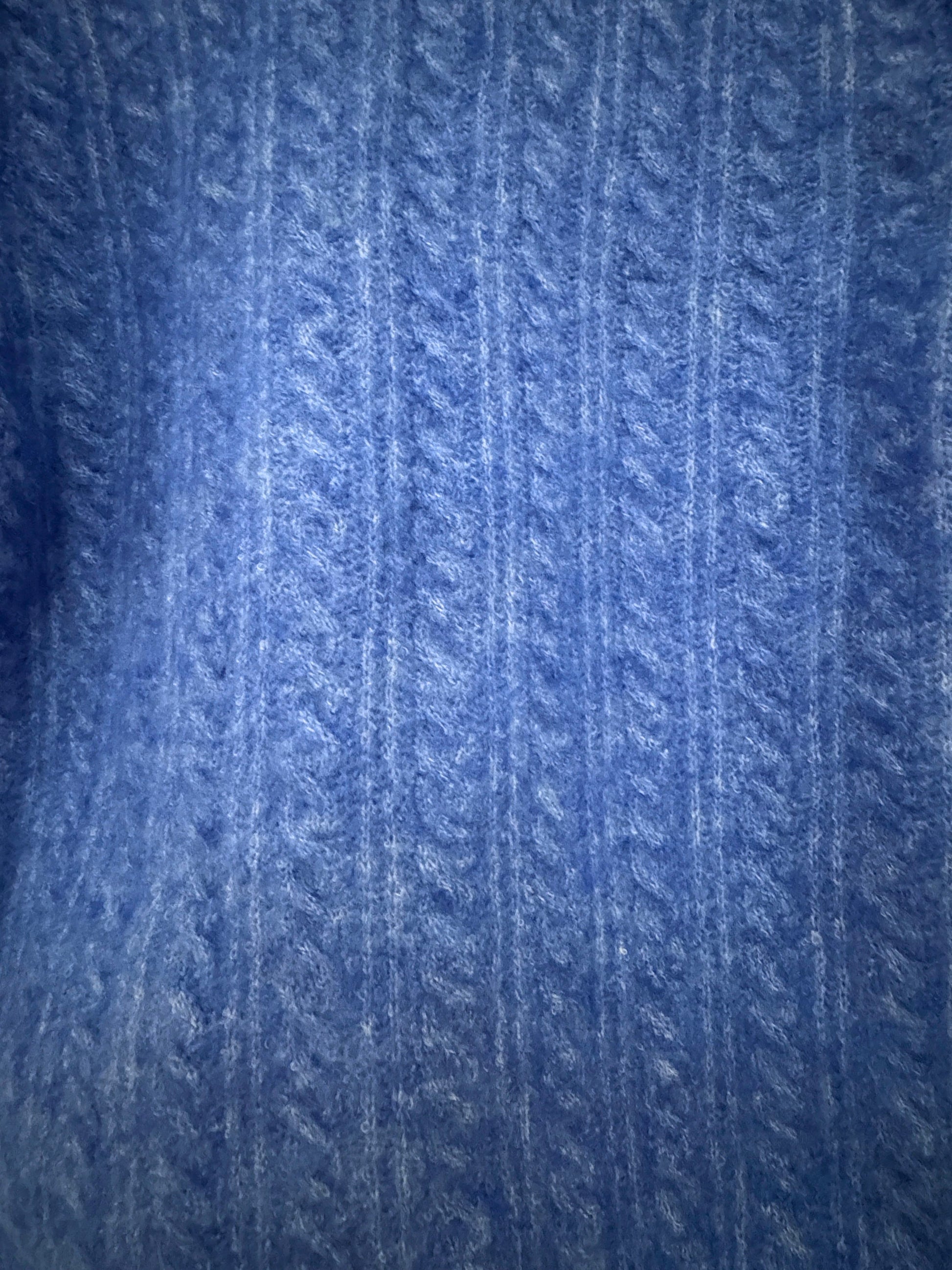 Sézane Perrine wool blend blouse made from mohair wool in cornflower blue with cable knit design.