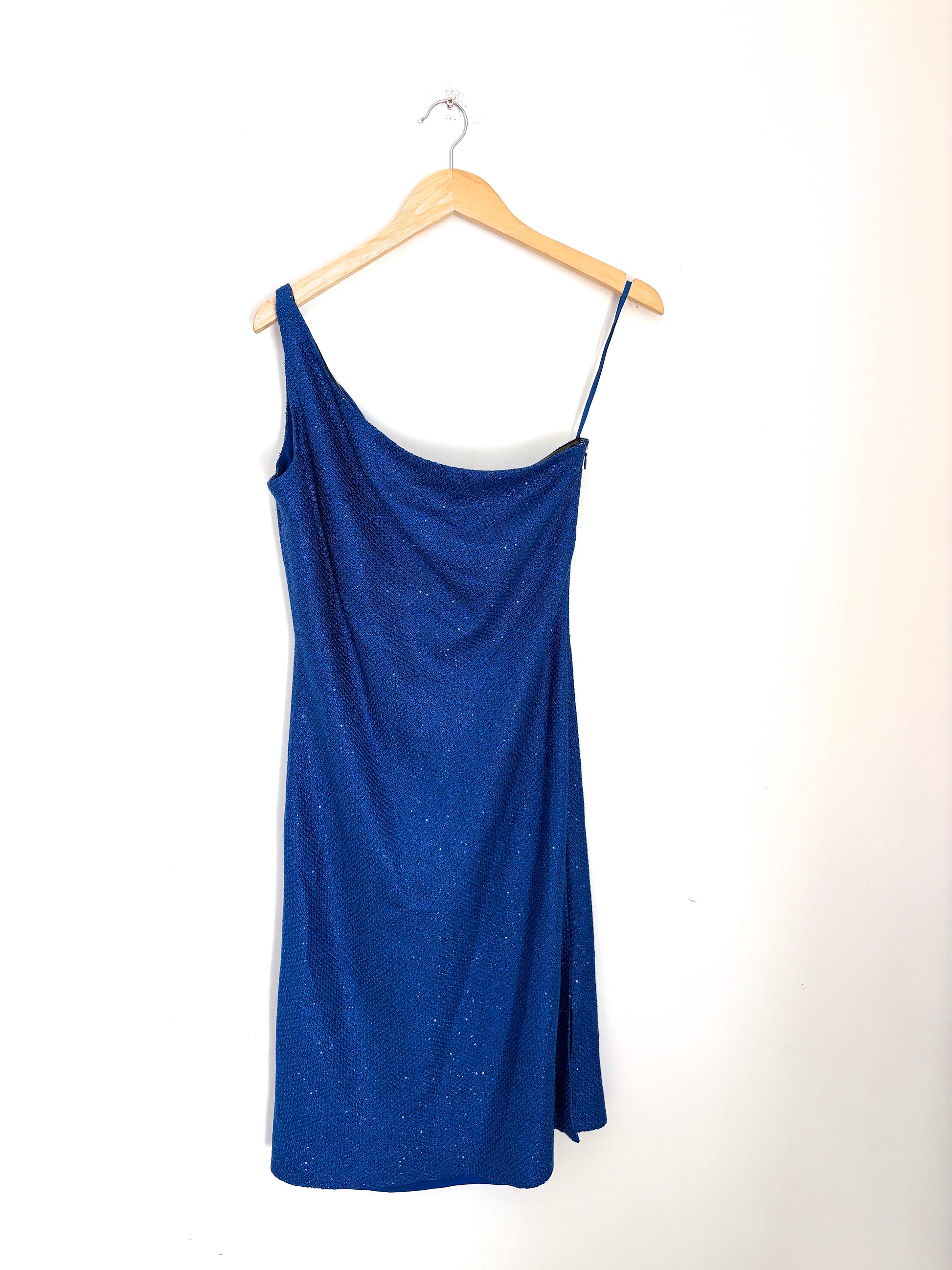 St John electric blue sequin one shoulder dress with side zip fastening.