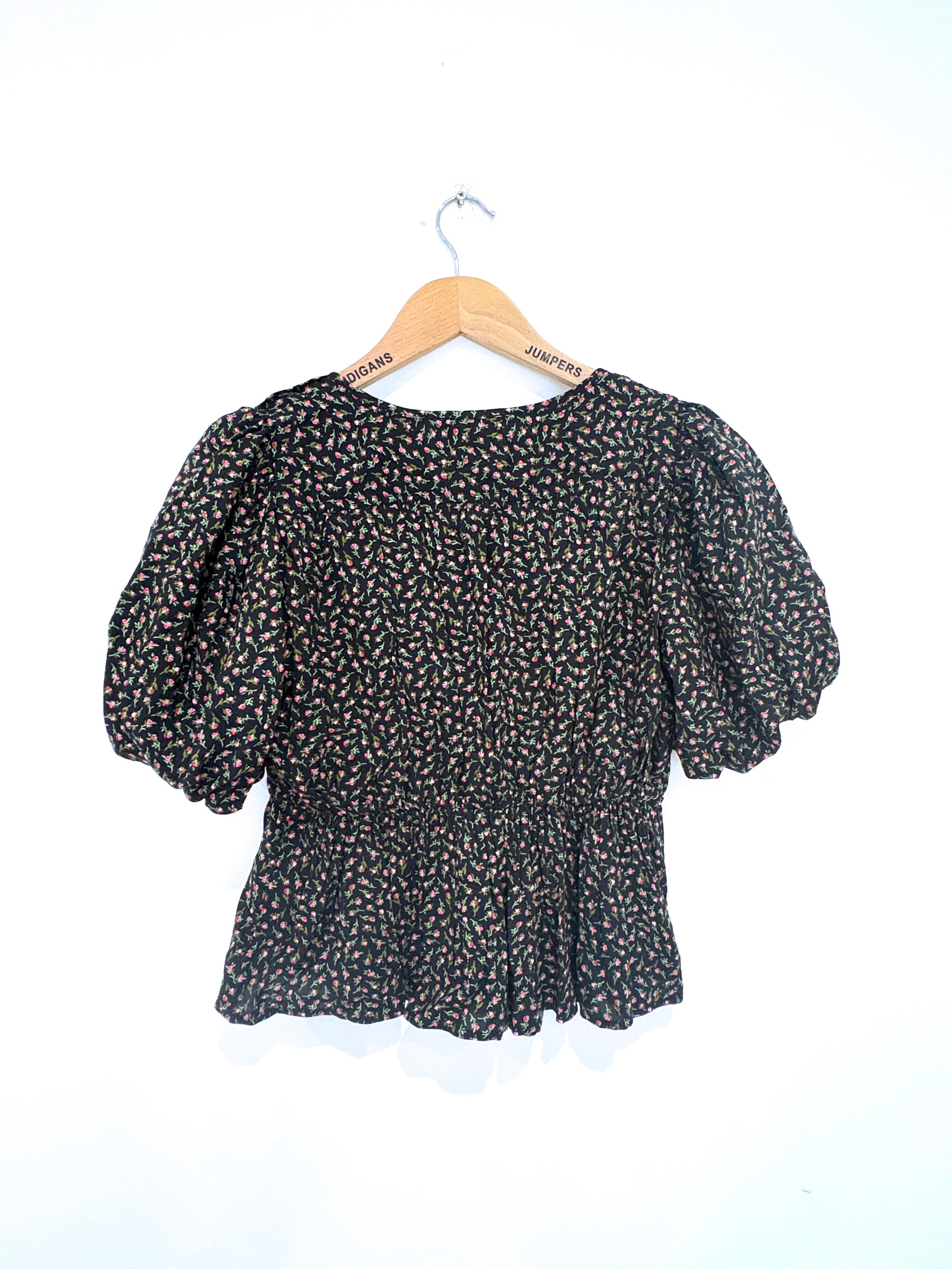 Nobody's Child in pretty rosebud print with v-neckline short puff sleeves and peplum hem.