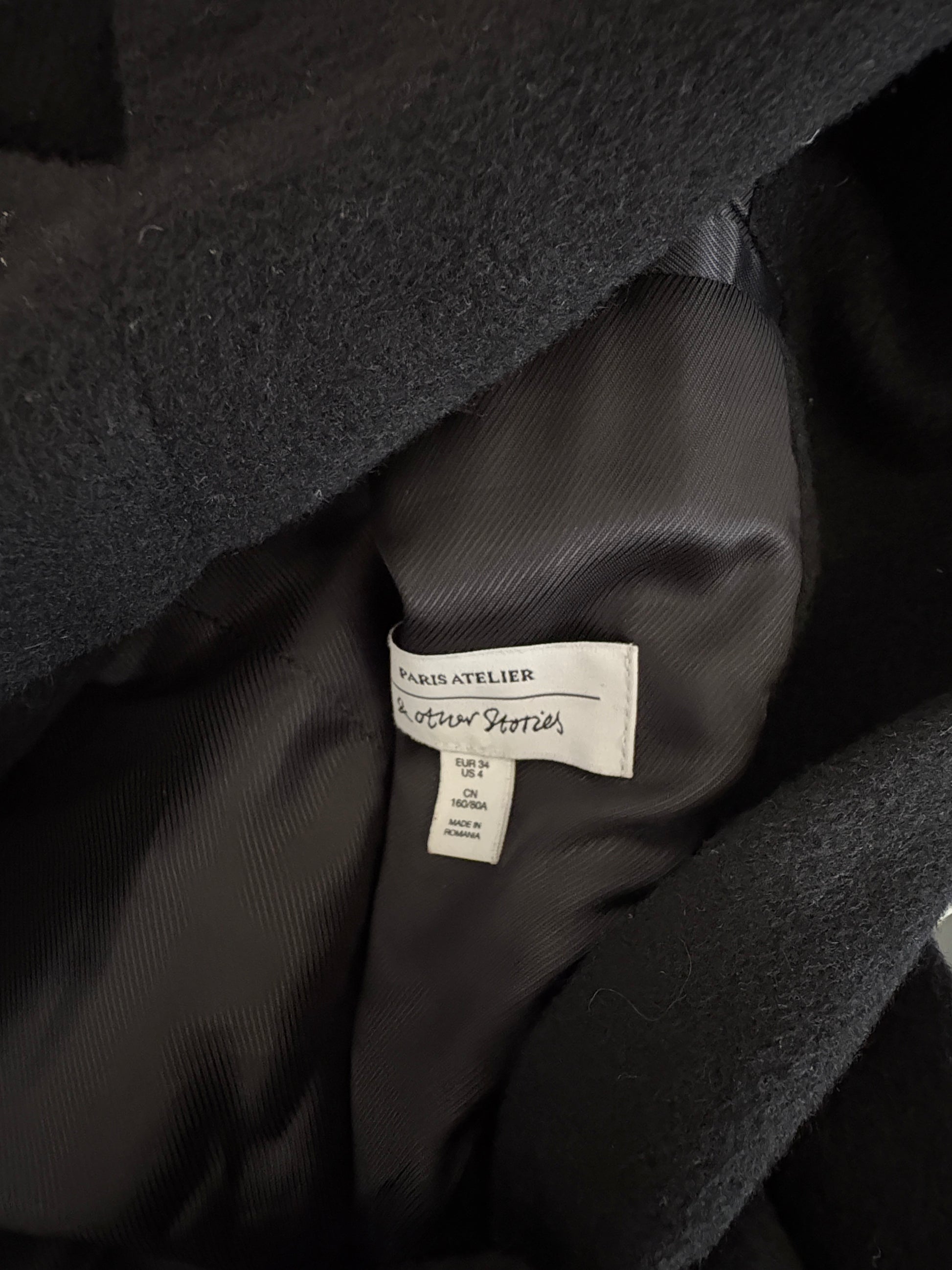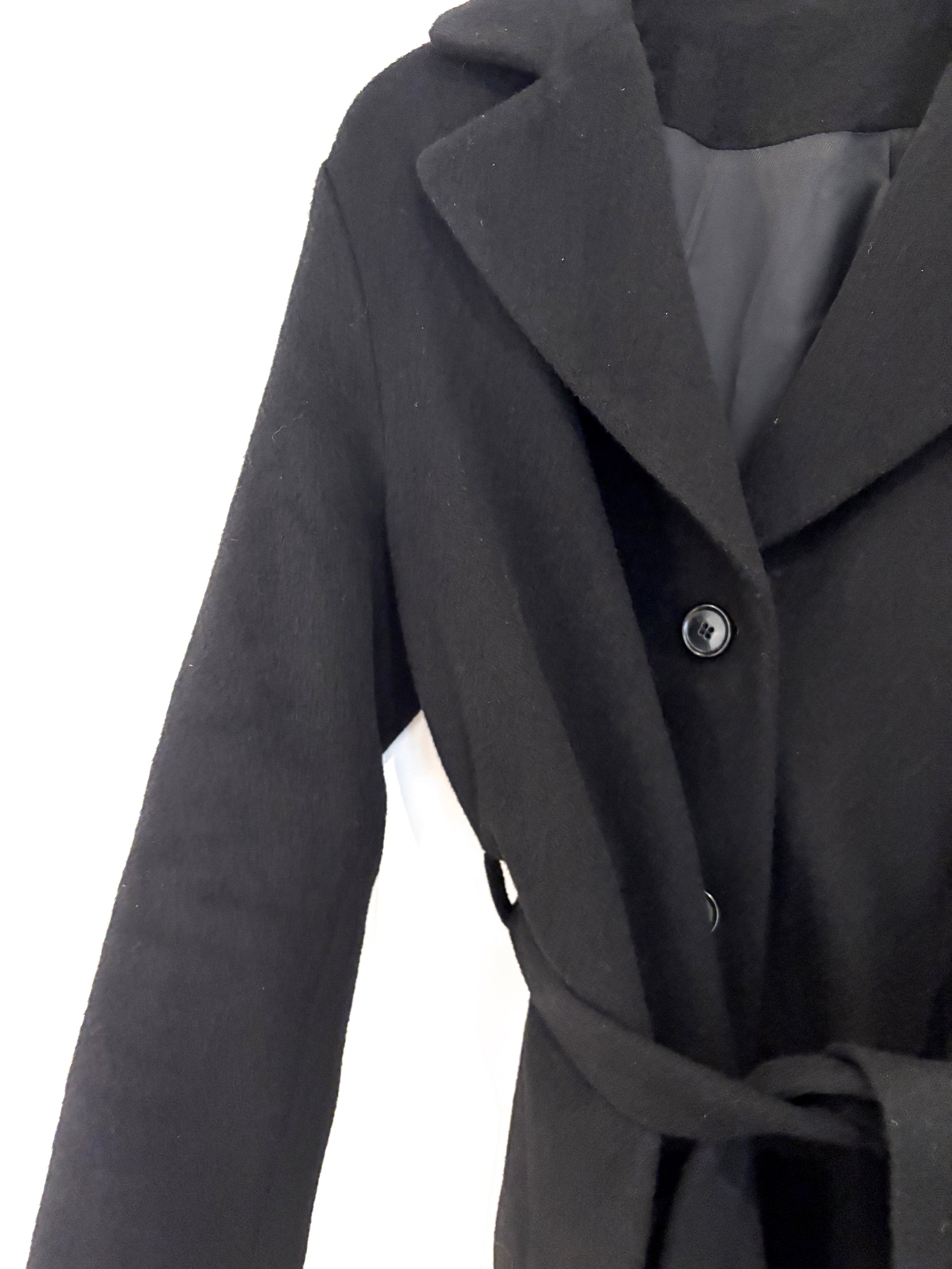 & Other Stories belted black coat with buttoned fastening and slits at the back. Made from a soft and fuzzy alpaca/wool blend. Waist cinching yet loose fit.