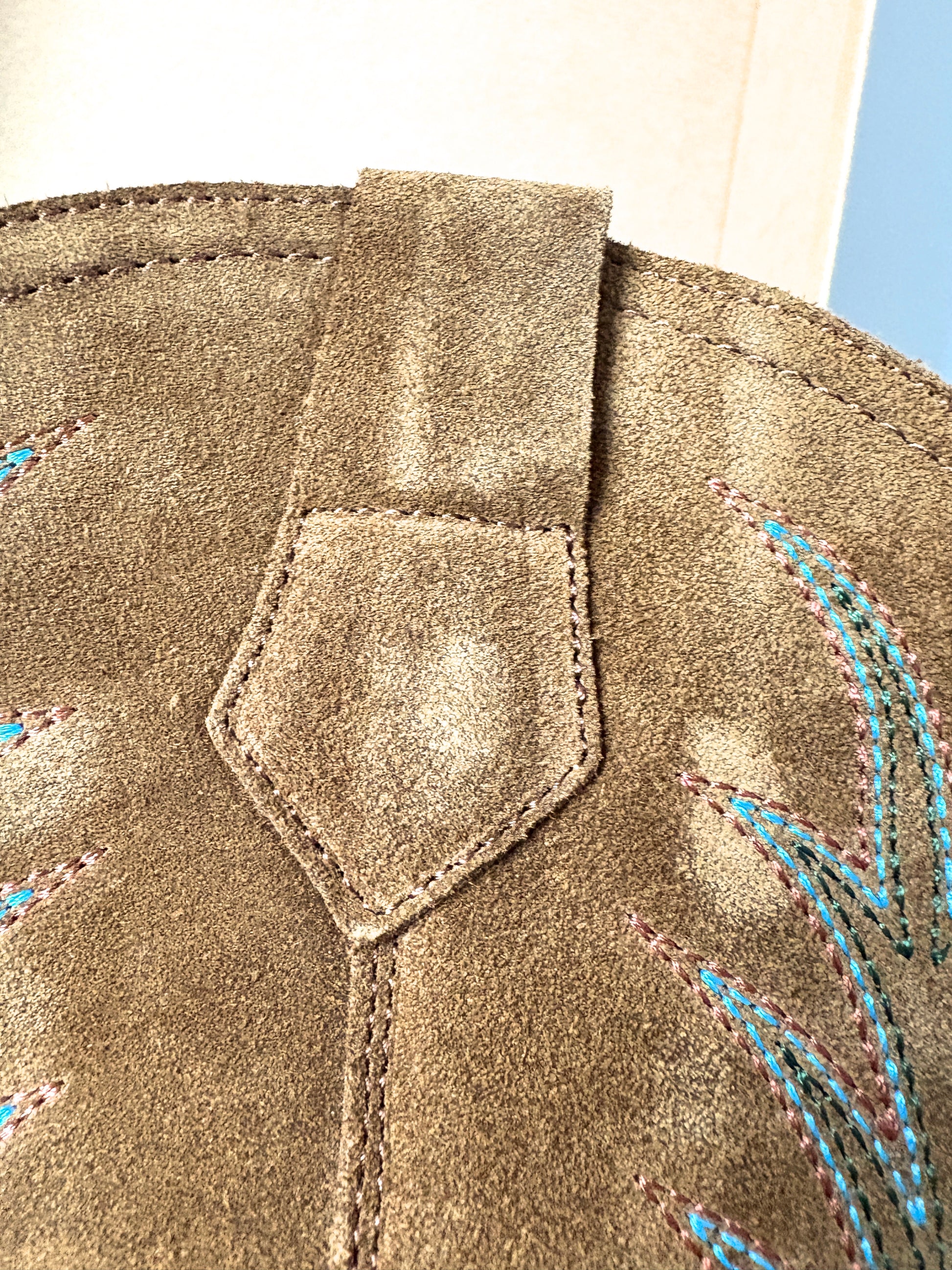 Penelope Chilvers Goldie Embroidered boot is a quintessential cowboy boot cut as a high midcalf, the Goldie is designed in a perfect winter tan suede with authentic Western embroidery in coloured triple stitch throughout. The distinctive cowboy silhouette with Cuban heel, elongated toe line and slim fit gives this style real character and attitude.