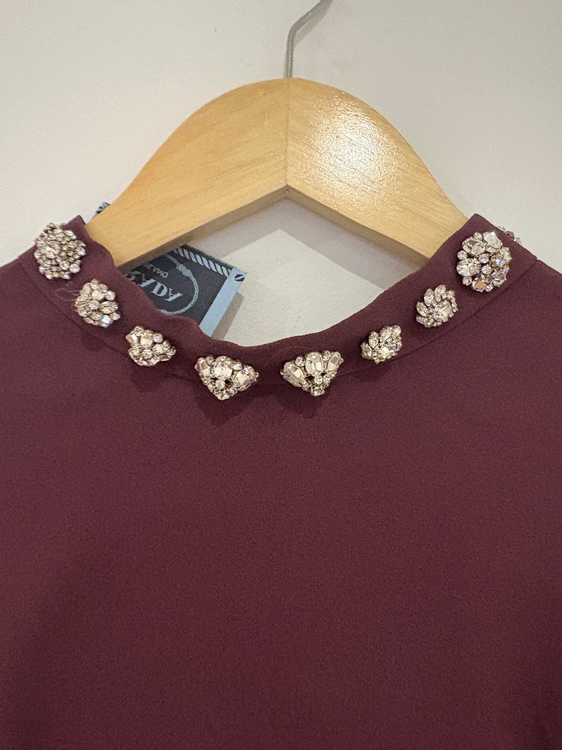 Prada burgundy midi crepe dress with gem stone neckline and bow tie fastening at the back.
