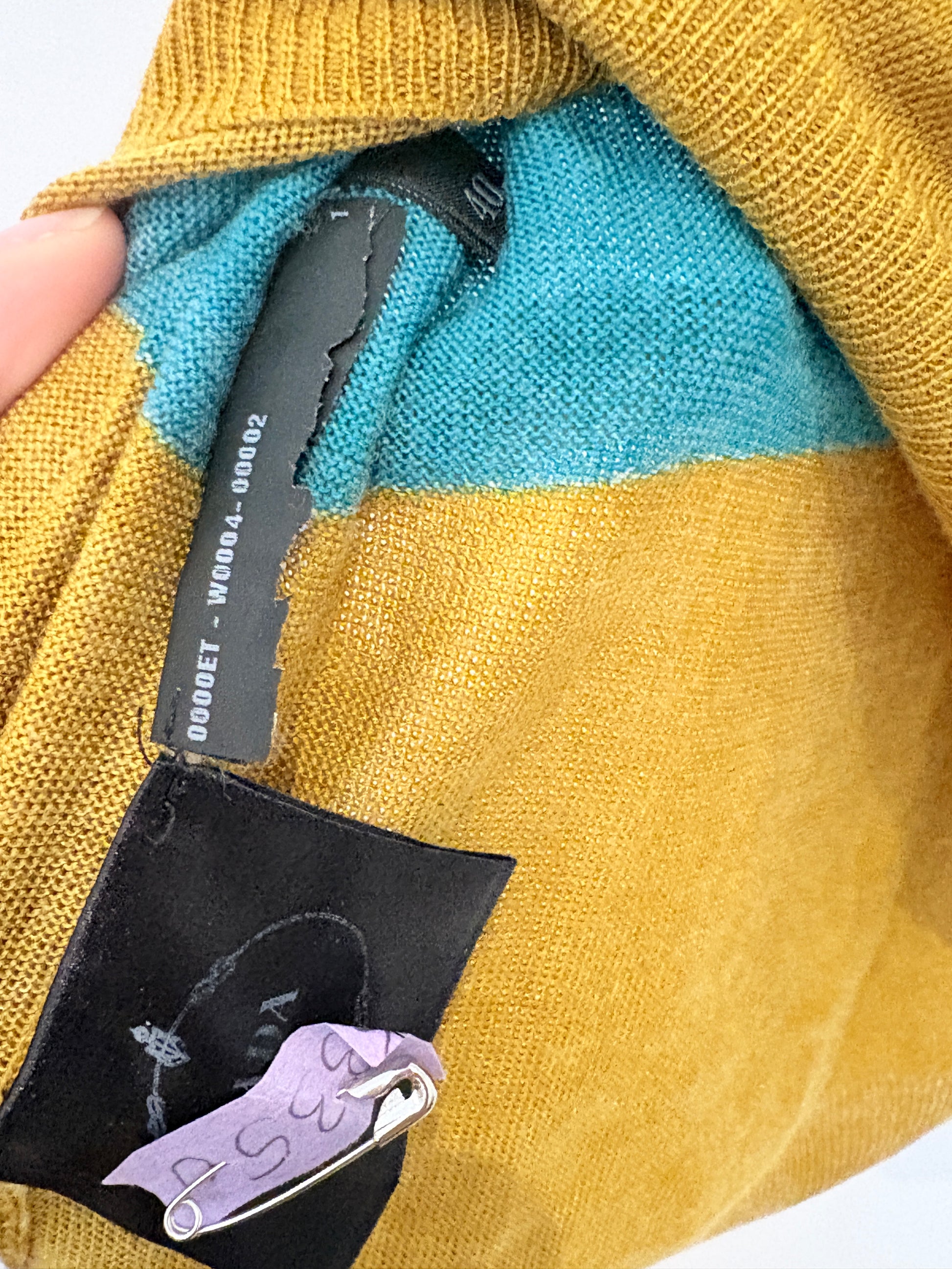 Prada floral blue and yellow v-neck knit with short sleeves made from wool and silk blended fabric.