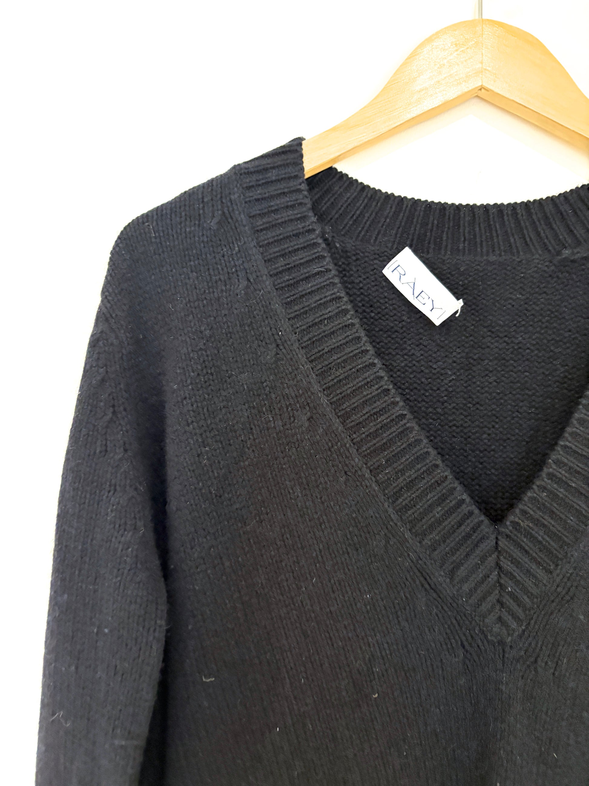 RAEY recycled cashmere and wool in a navy black featuring a deep V-neckline, dropped shoulders and a floor-grazing length for a relaxed mood.