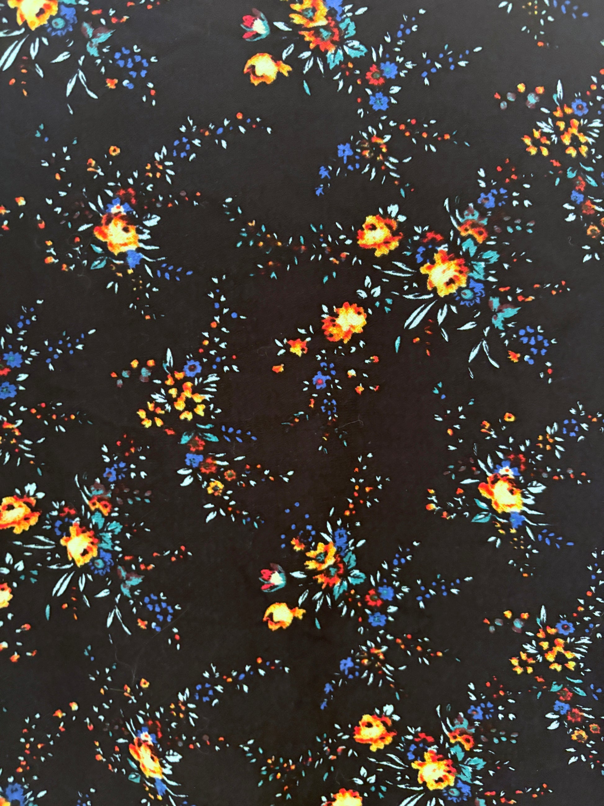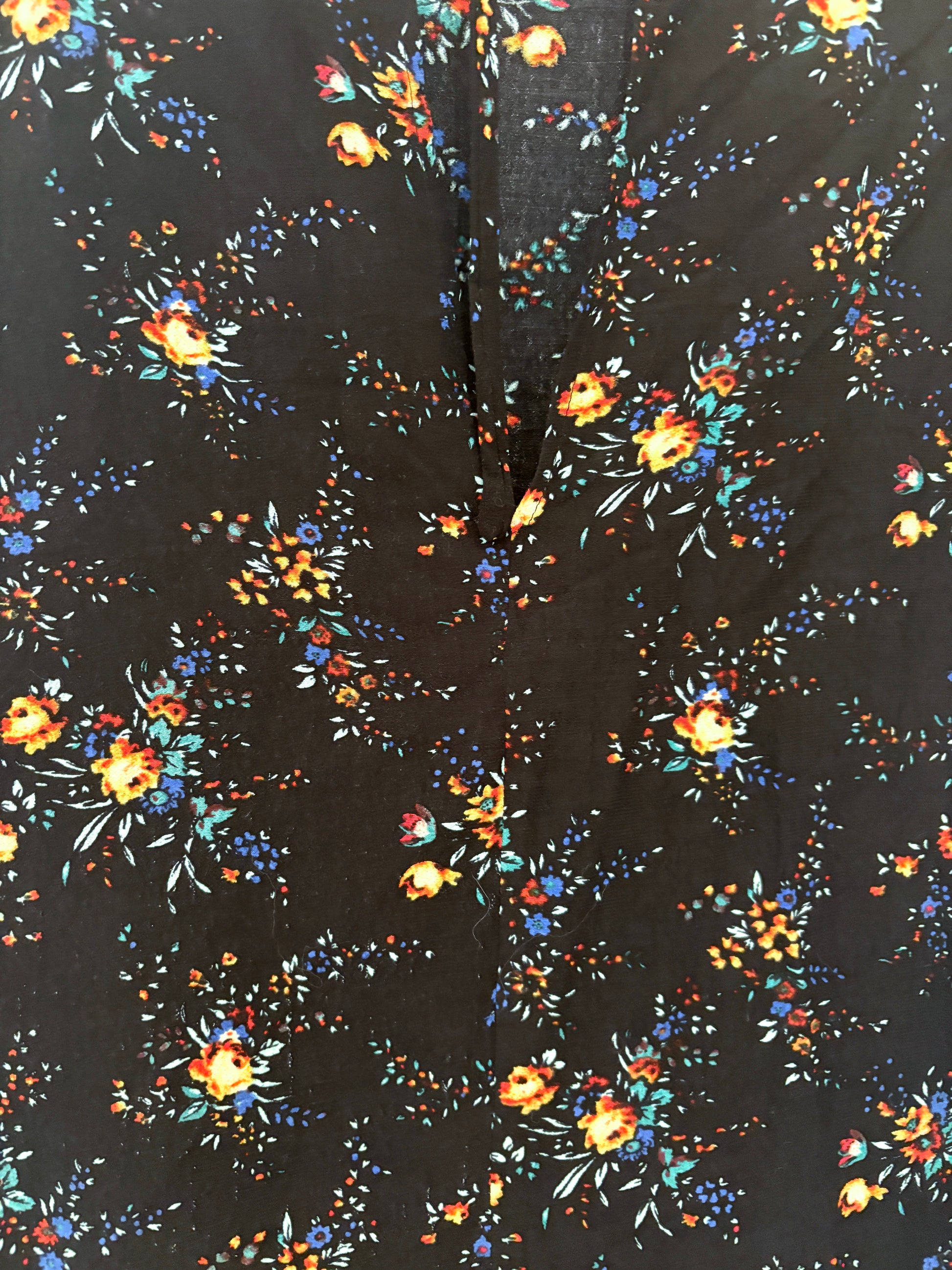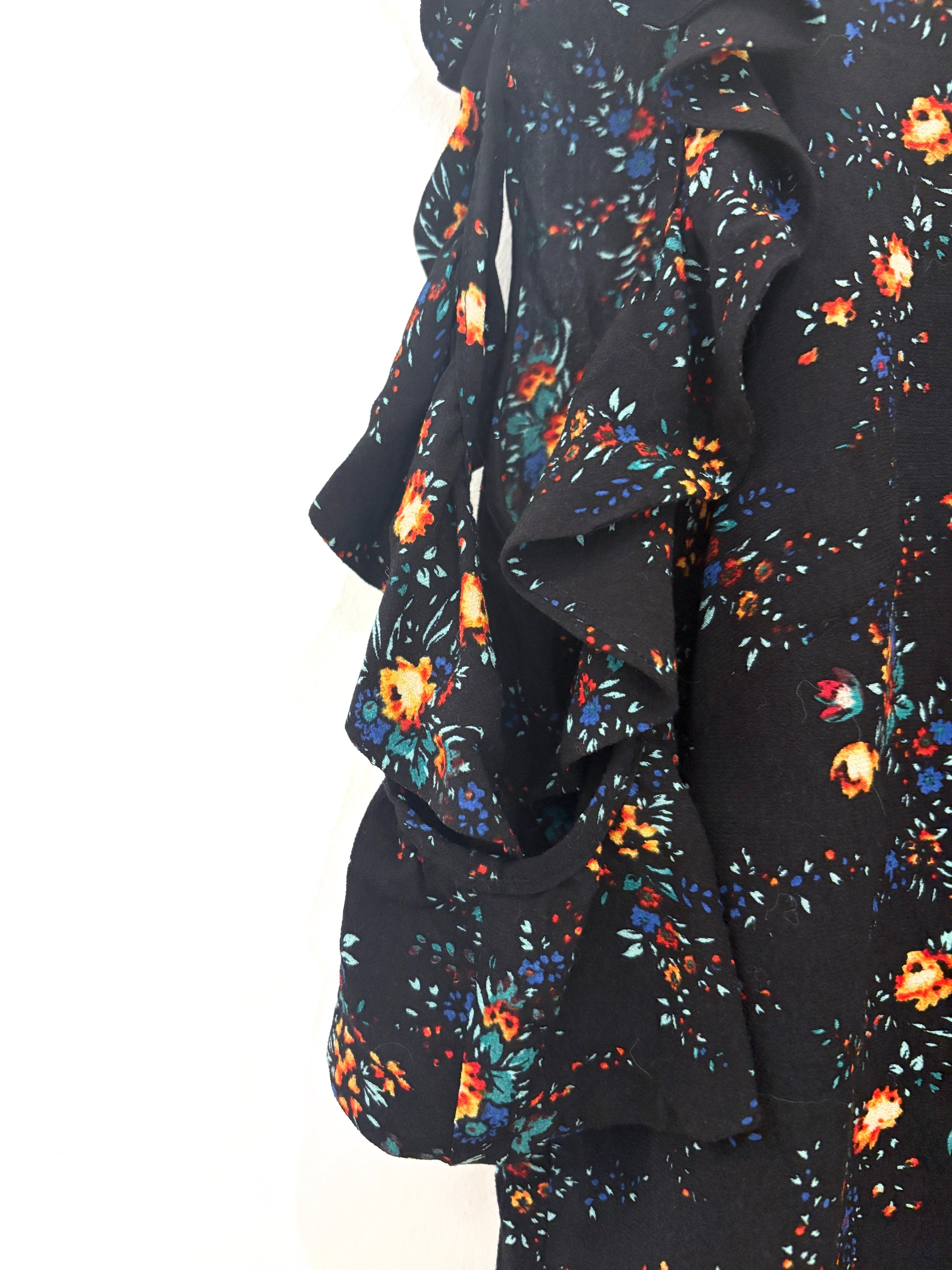 Sandro black floral print blouse with ruffle embellishment and sash tie closure at the back.