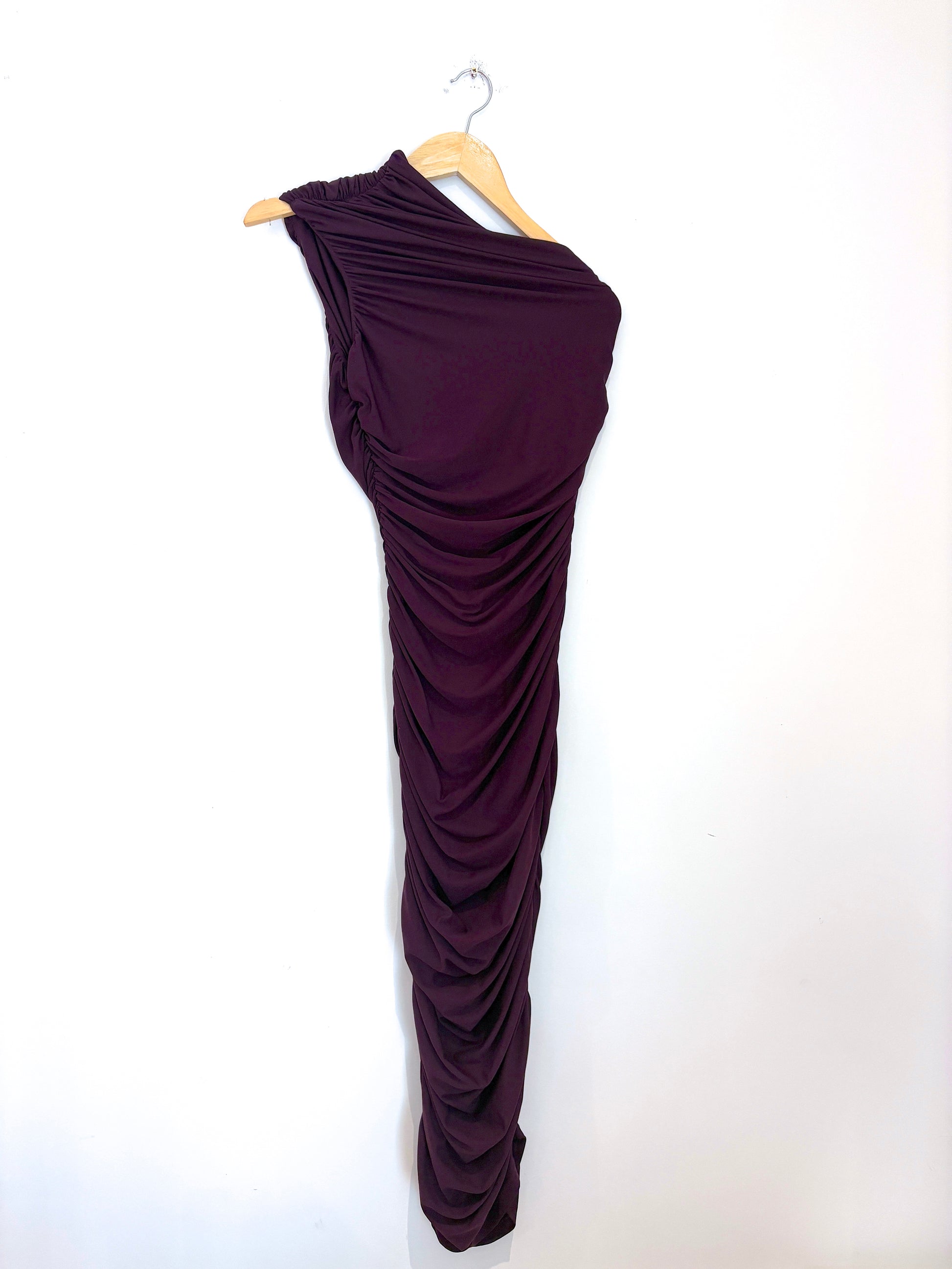 Solace one shoulder Amaya ruched midi dress in plum made from a shiny jersey stretch fabric.