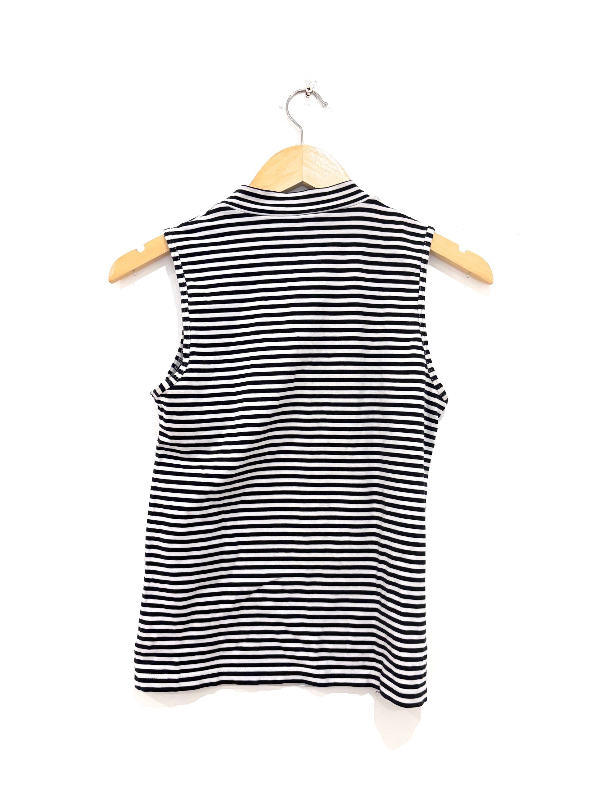 Theory stretchy black and white striped jersey sleeveless top with polo-neck.