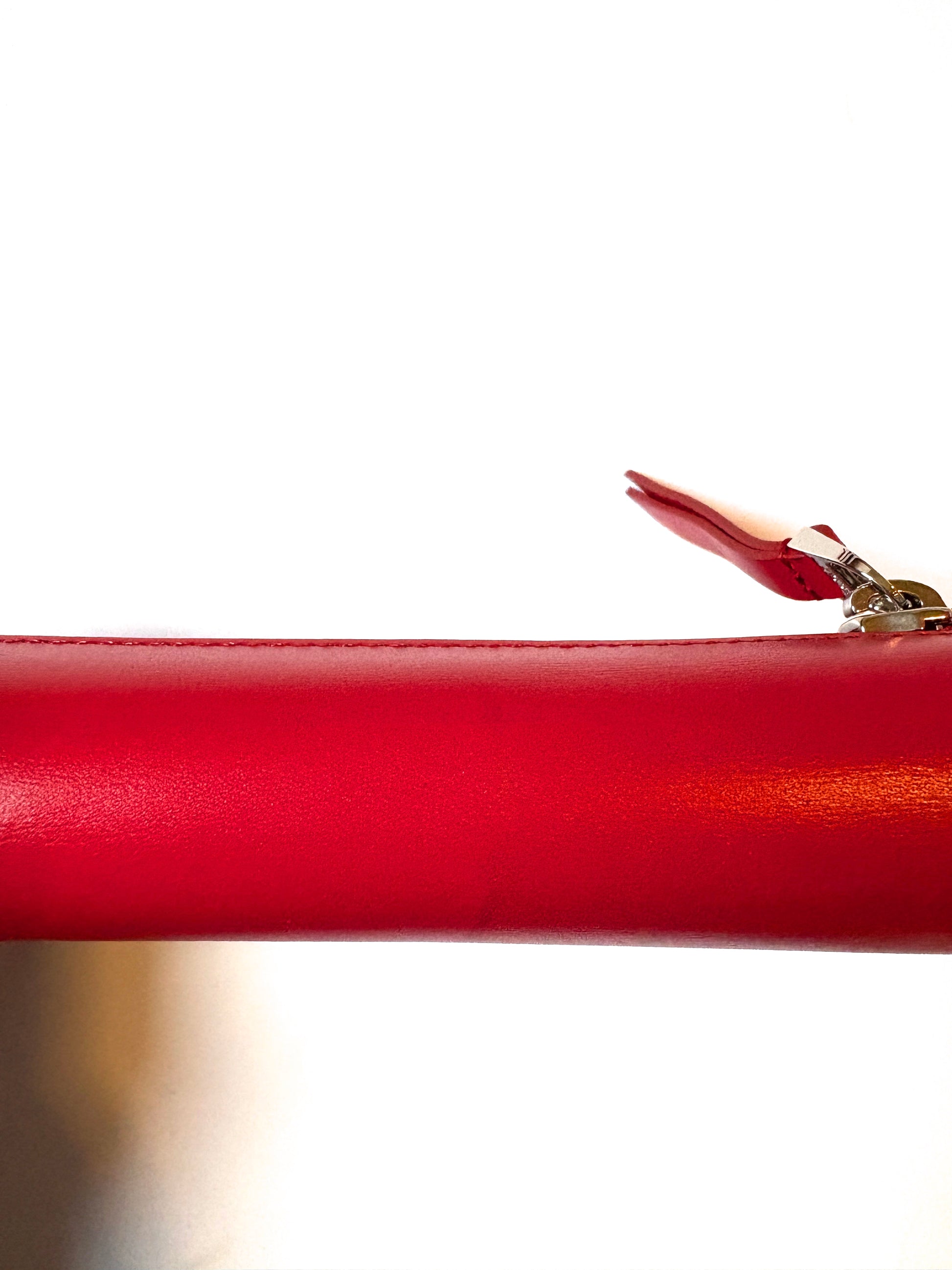Tod's double-t red rectangular leather bag with silver hardwear and magnetic closure. Long adjustable strap.