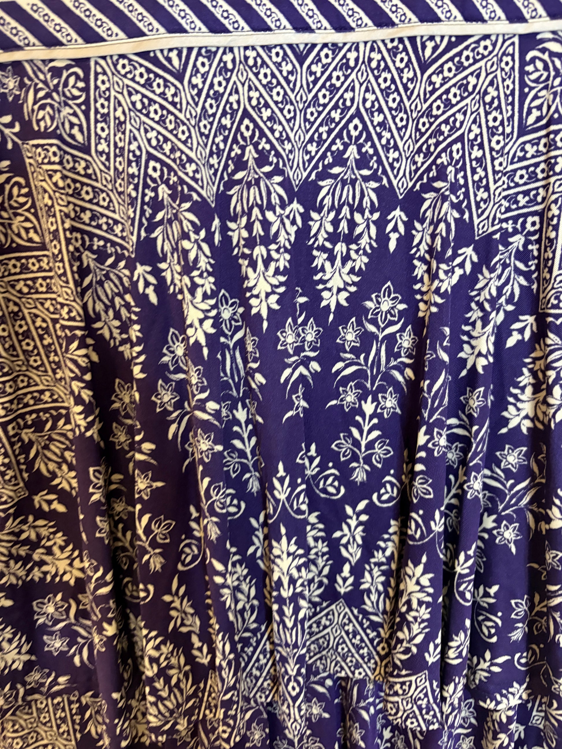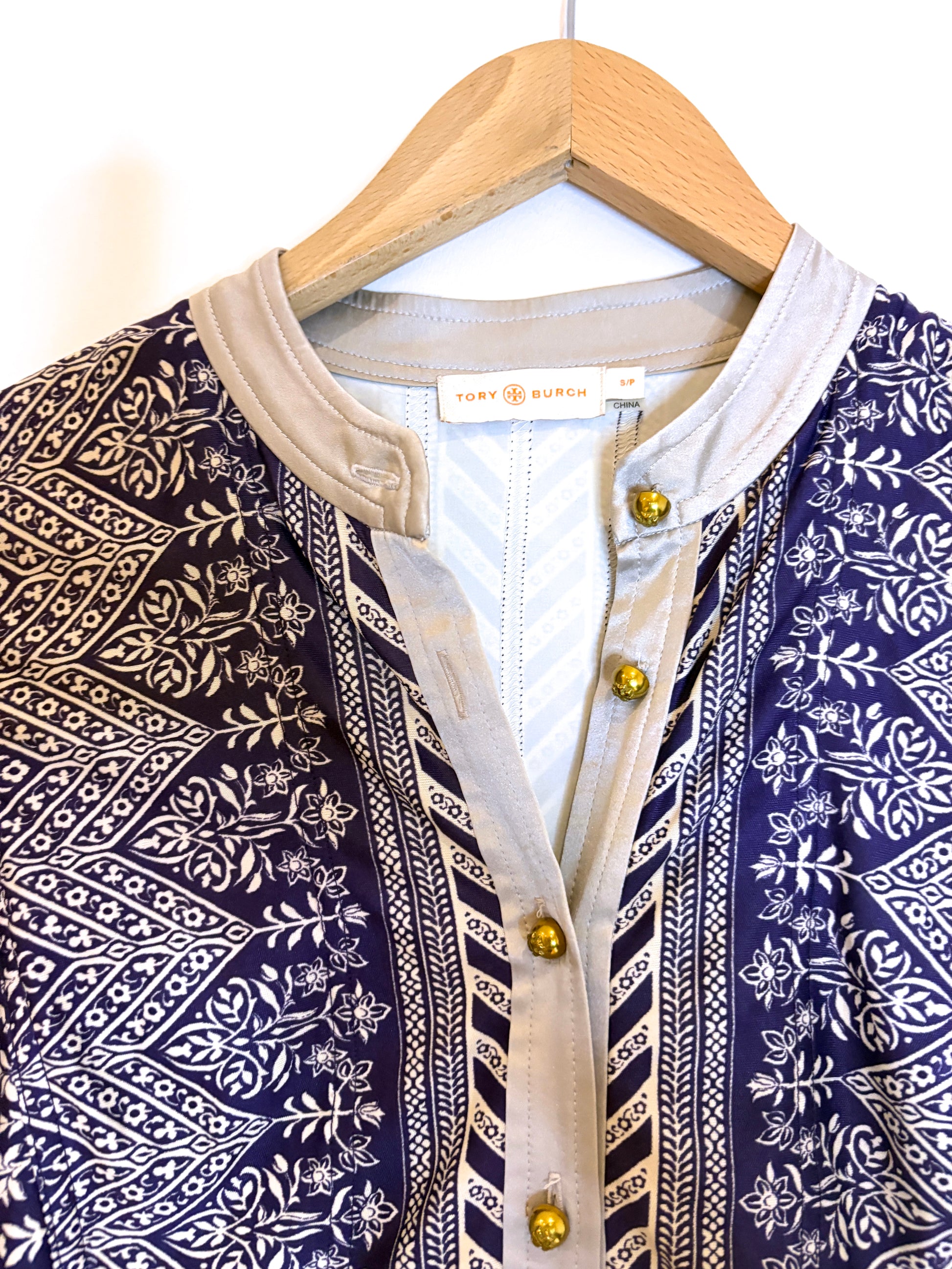 Tory Burch purple and cream Tovero dress with long, cuffed sleeves and a two-tiered skirt that stops at knee length. The small gold buttons up the front are the perfect added touch. Made from a stretchy viscose silk blended jersey fabric.