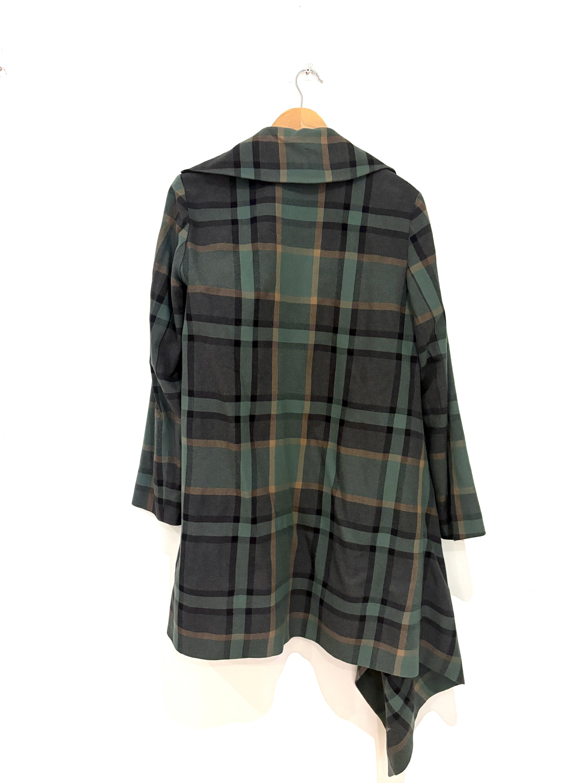 This Vivienne Westwood plaid coat features an asymmetrical cut and draping on the front.