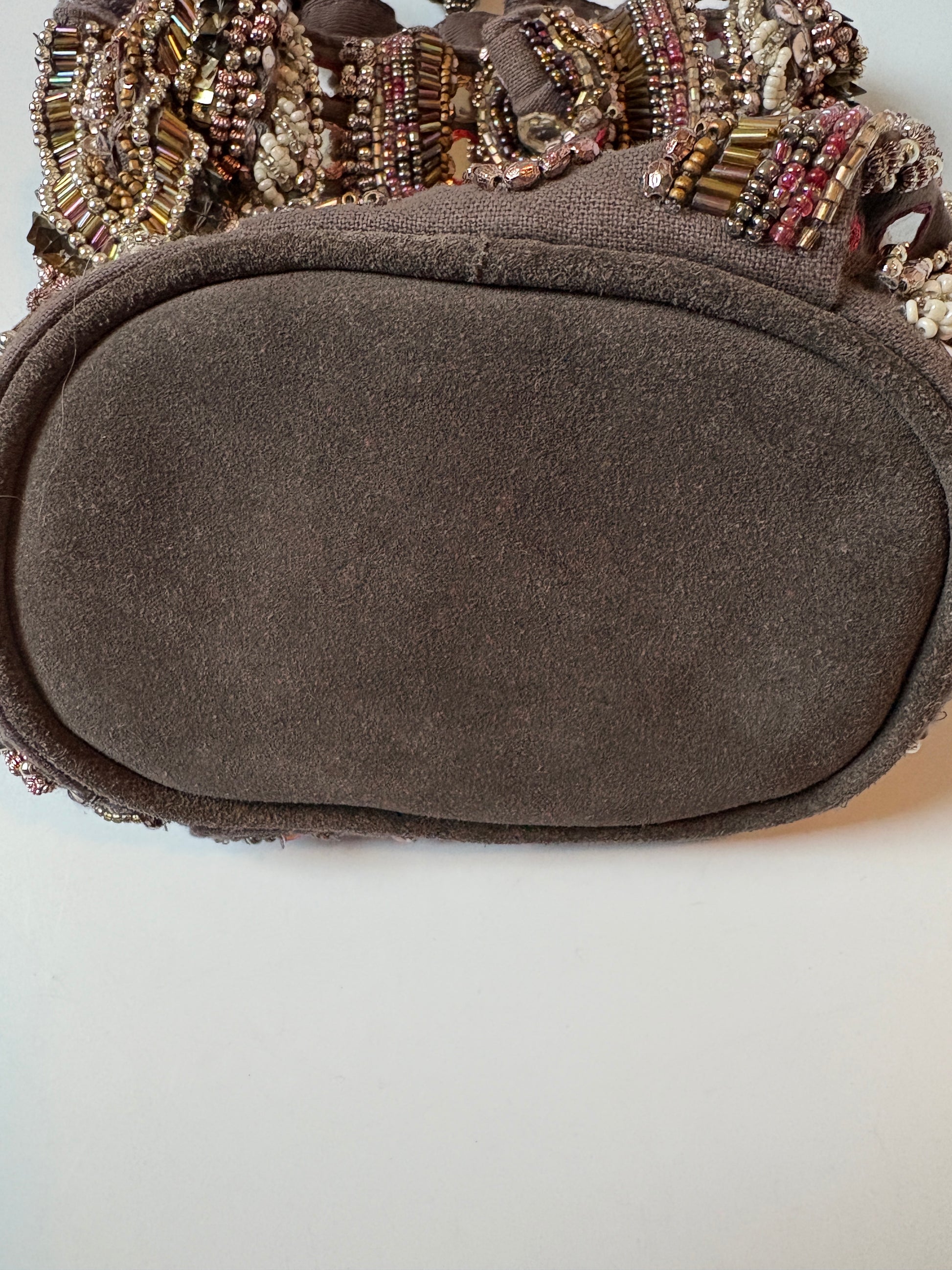 Beautiful Zara beaded cross body bucket bag with tassles in brown suede.